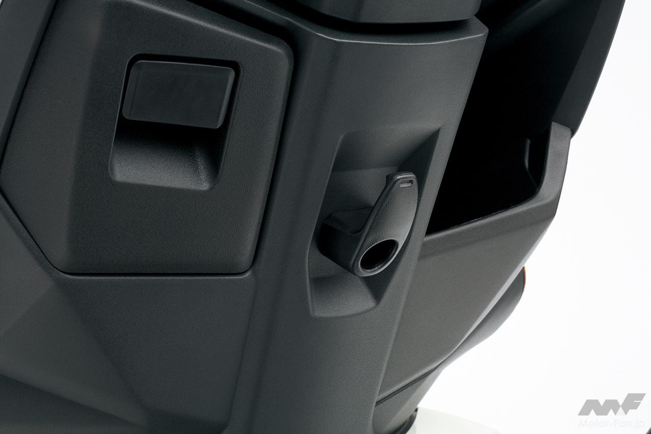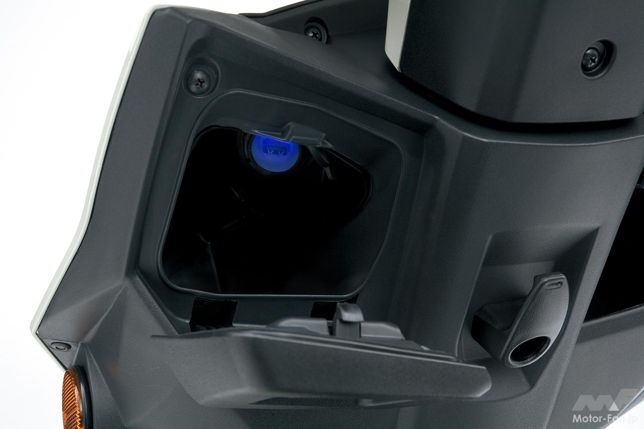 足下には左側にふた付きのフロントインナーボックス(最大積載許容重量:0.5kg)、フロントインナーボックス内にはスマートフォンの充電などに便利なUSB ソケット(定格5V/2A)を設置。