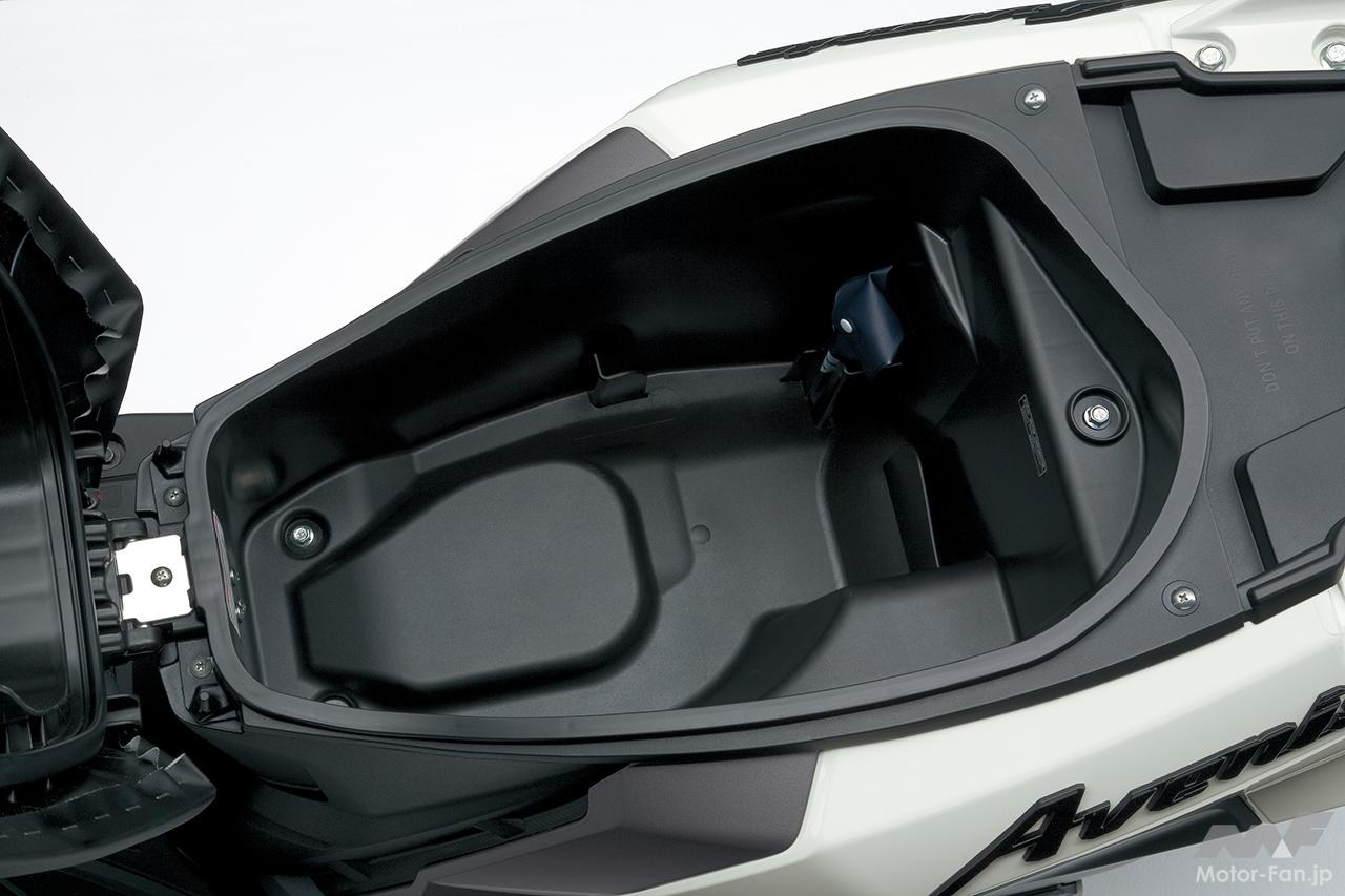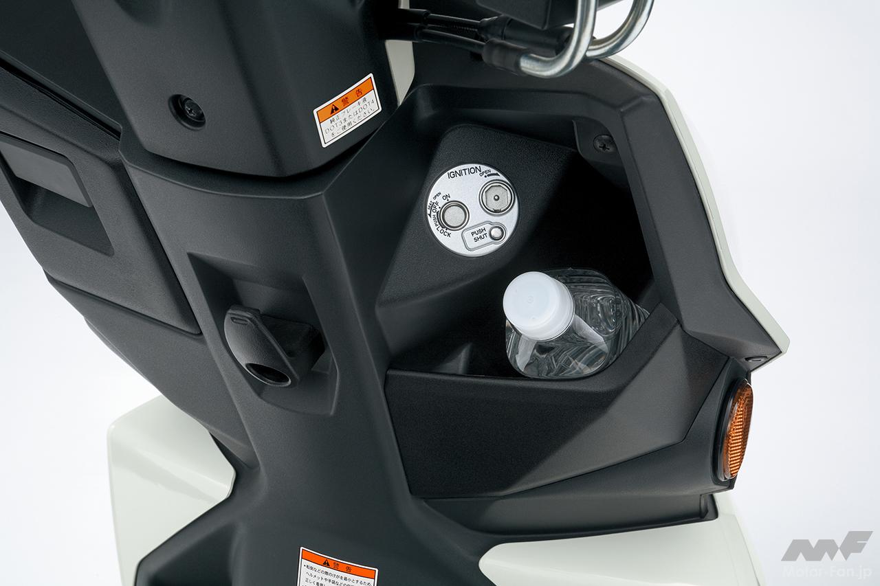 シート下には収納に便利なトランクスペースを確保(容量:21.5L/最大積載許容重量:3kg)。また、ヘルメットホルダーを左右に1個ずつ装備。