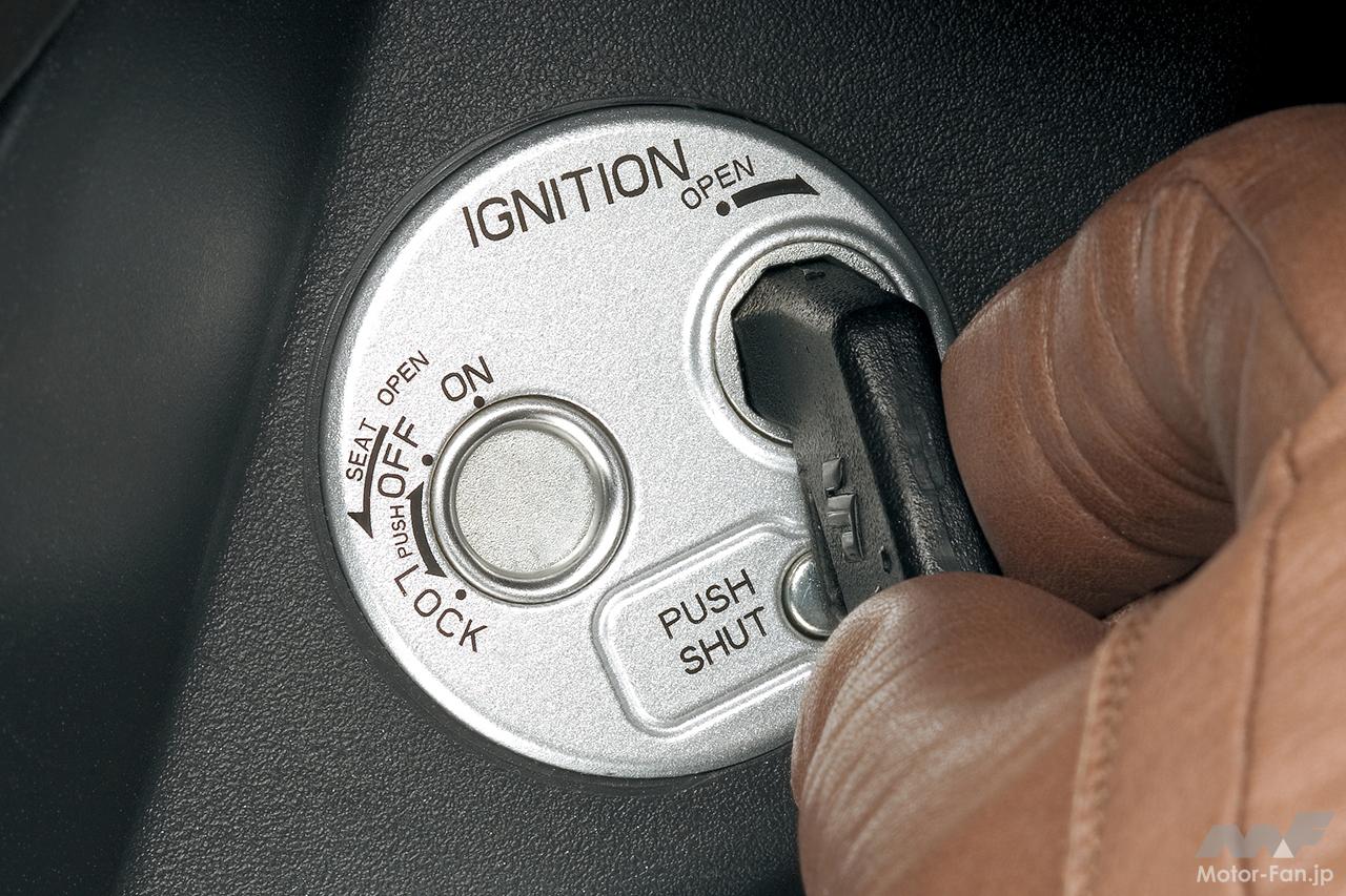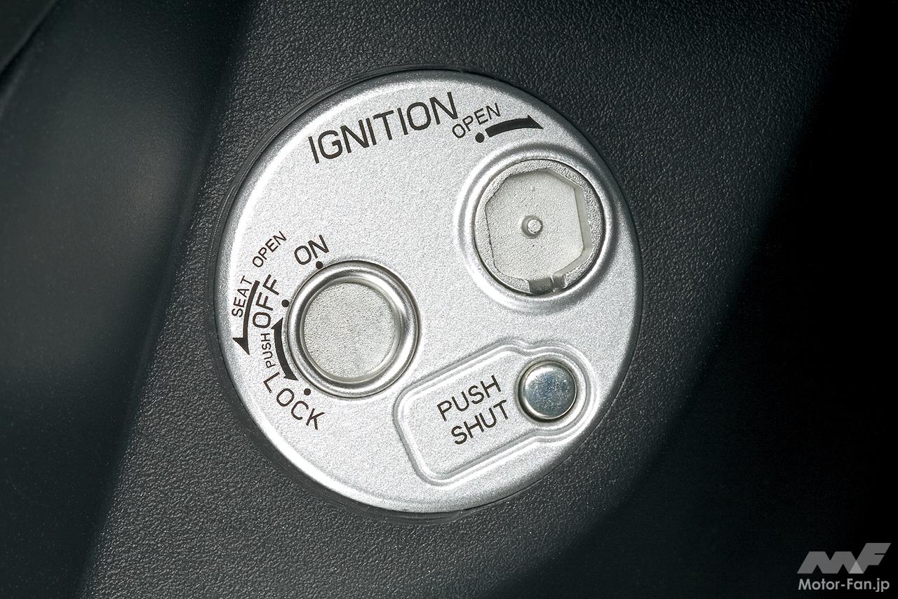 鍵穴へのいたずらや盗難を抑止する、シャッター付きのキーシリンダーを装備。キーシリンダーは、シートオープンと一体になった集中ロック式を採用。また、ワンプッシュでシャッターを閉め、鍵穴をしっかりガードする新しい機構も導入済み。