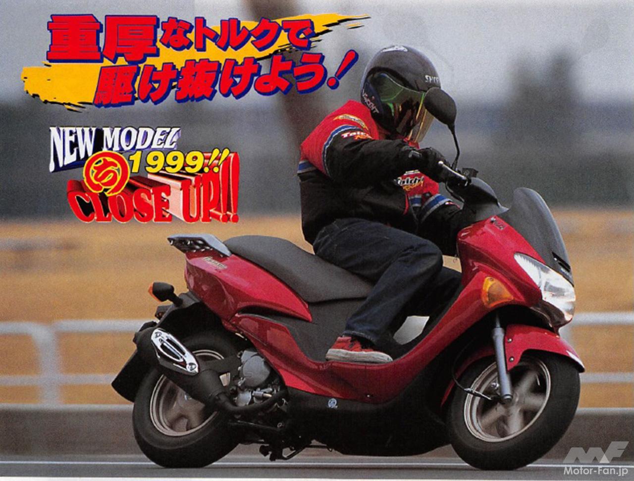 初代のアヴェニス(写真下)は1998年12月(1999年モデル)、流麗かつスポーティで個性的な外観デザインを備え、軽快で上質感のある走りを追求したスクーターとして誕生した。