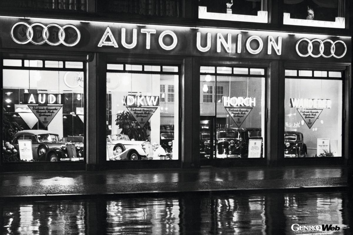 しかし1932年にホルヒとアウディはDKW、ヴァンダラーとともに4社合併となりアウトウニオン社となる。4社が合併したことから4つの輪がつらなるロゴマークが採用されたのである。4つ輪のマークはすべての製品につけられたが、4つのブランドはそれぞれ存続する形だった。