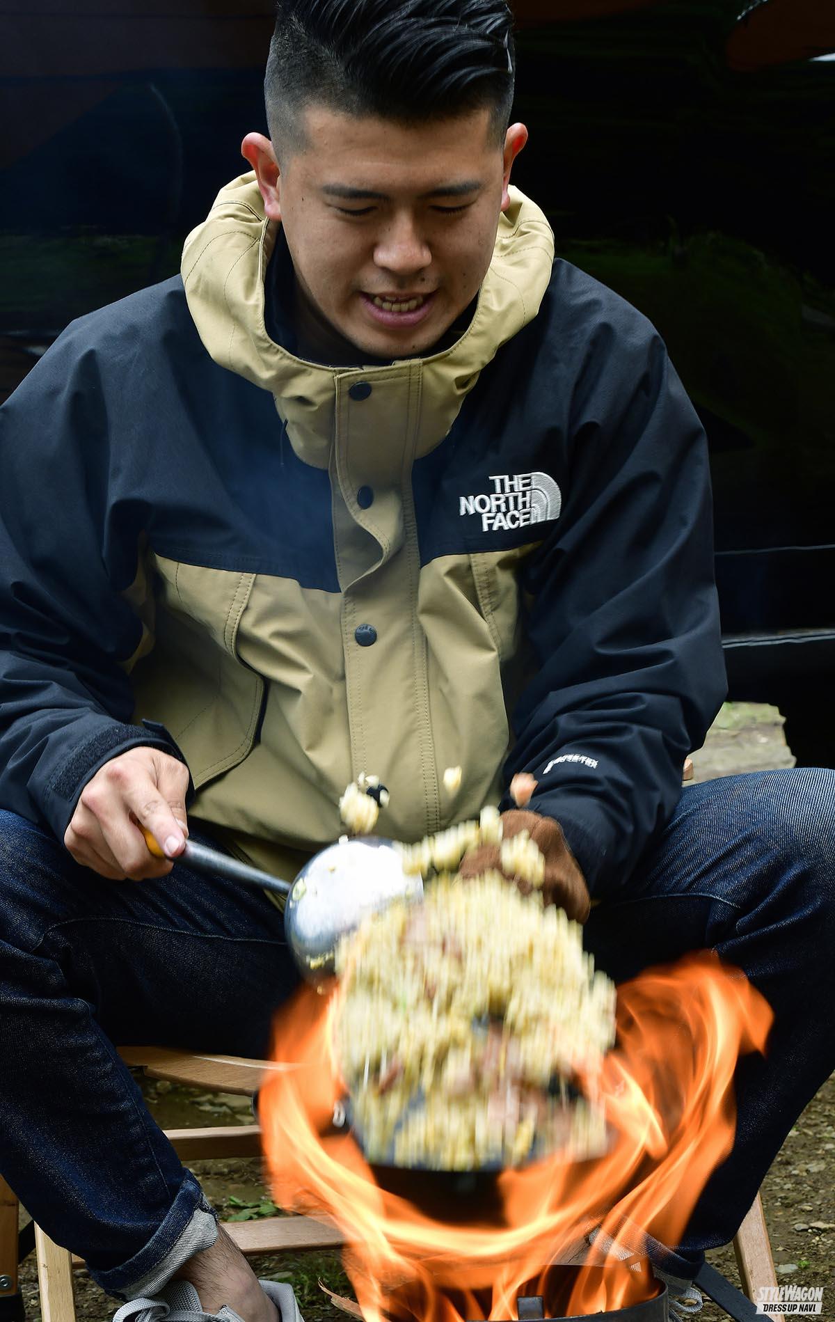 ゆったりとタープを広げ、愛車の屋根にはルーフテント、そして吊り下げられた様々な料理道具。しかも食事時には中華鍋を振ってチャーハンを振る舞う。元料理人という原さんのキャンプサイトからはただ者ではない雰囲気が漂っていた。さぞやこだわっているのか思いきや、「こだわっていないからなぁ」とのこと。聞くと、「好きなモノを集めだけ」、料理に関しても「キャンプの時は簡単なモノ」との答え。「家で下準備して、仕上げをやる程度」なのだそう。この日はチャーハンだったが、過去には回鍋肉、アヒージョ、パスタ、サンマの塩焼き等々。もちろん冷凍モノやレトルトではない。ハンバーガーも「家でパテを作って」と手間をかけている。しっかりと、元プロらしく。おそらく、彼にとって、その程度の作業は“大したことない”事柄なのだろう。