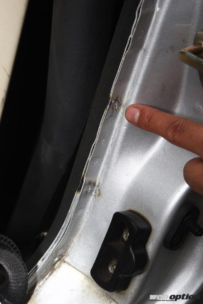 オープンボディで経年変化もある…と考えると、気になるのがボディ剛性。そこで補強バーなどを装着したくなるが、重量増を嫌うコーンズではドア開口部とサイドシル下面のスポット増しで対応している。「他の方法で対策できるなら、余計なモノは付けない。これが基本です」と木村さん。