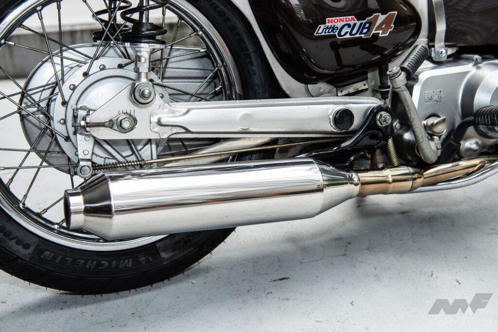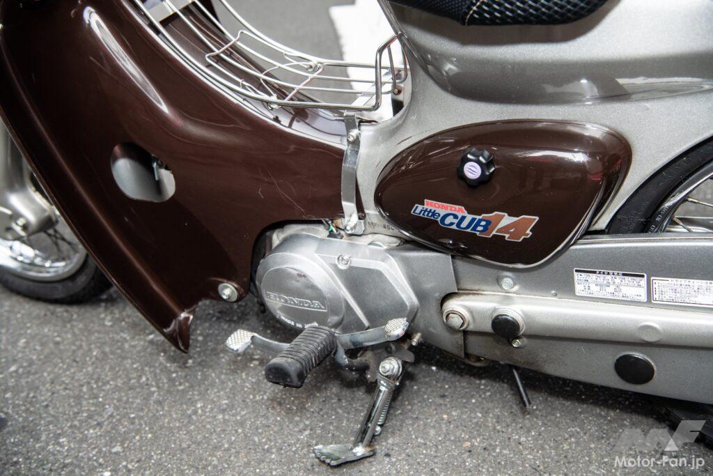 ローダウンの手法はいたって簡単。フロントはフォークを分解して短くカットするショート加工を施した。フロントのカット分に合わせてリヤにはローダウンサスペンションを組み込む。これだけのことだが、ただでさえ14インチタイヤで低く見えるリトルカブがさらに低く構えた姿になる。前後ともタイヤがフェンダーに隠れるほどローダウンしているので、当然のようにサイドスタンドが長くて使えなくなる。そこでショートタイプの社外品に変更した。これでも「走れる車高短」だそうだ。