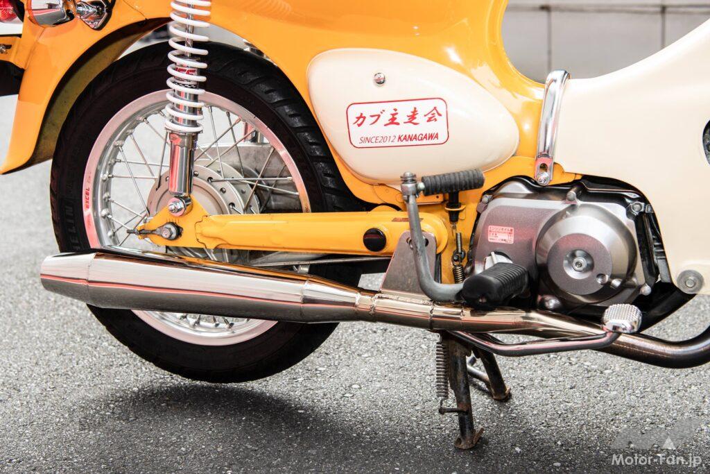 イエローのボディが可愛らしいこちらは、29歳のオーナーが10年ほど前に通学用として購入したもの。当初はご近所用として活躍していたが、走れば走るうちに走行性能を引き上げたくなったようだ。また50ccの原付1種だと高確率でお巡りさんに目をつけられる。2段階右折や30km/hの制限速度が足枷になるからだ。そこで進めたのがエンジンチューニング。JUNインターナショナルから発売されているチューニングキットを用いて、排気量を105ccにまで拡大しているのだ。さらにスーパーカブ100EXの4速ミッションを組み込み、JUNインターナショナル製強化クラッチでパワーアップに対応させている。晴れてピンクナンバーになり、一般車と同じ流れで走れるようになったのだ。