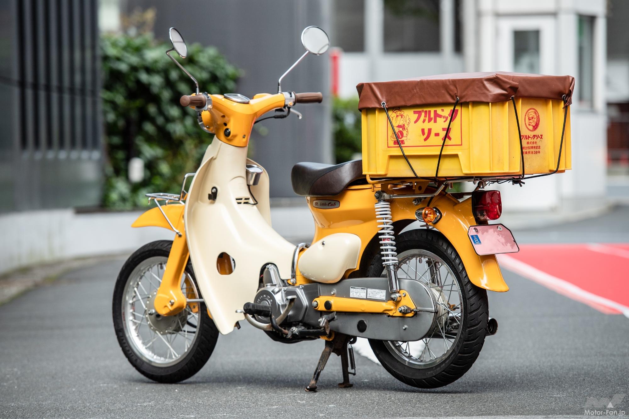 スタイルは純正のままでも可愛らしいリトルカブだから、ボディのカスタムは最小限に留めている。ヘッドライトをSP武川製のマルチリフレクタータイプにしつつサインハウス製LEDバルブを装着。ウインカーも変更して灯火類の印象を変えた程度だ。それよりもブルドッグソースの箱が印象的といった感じだろうか。