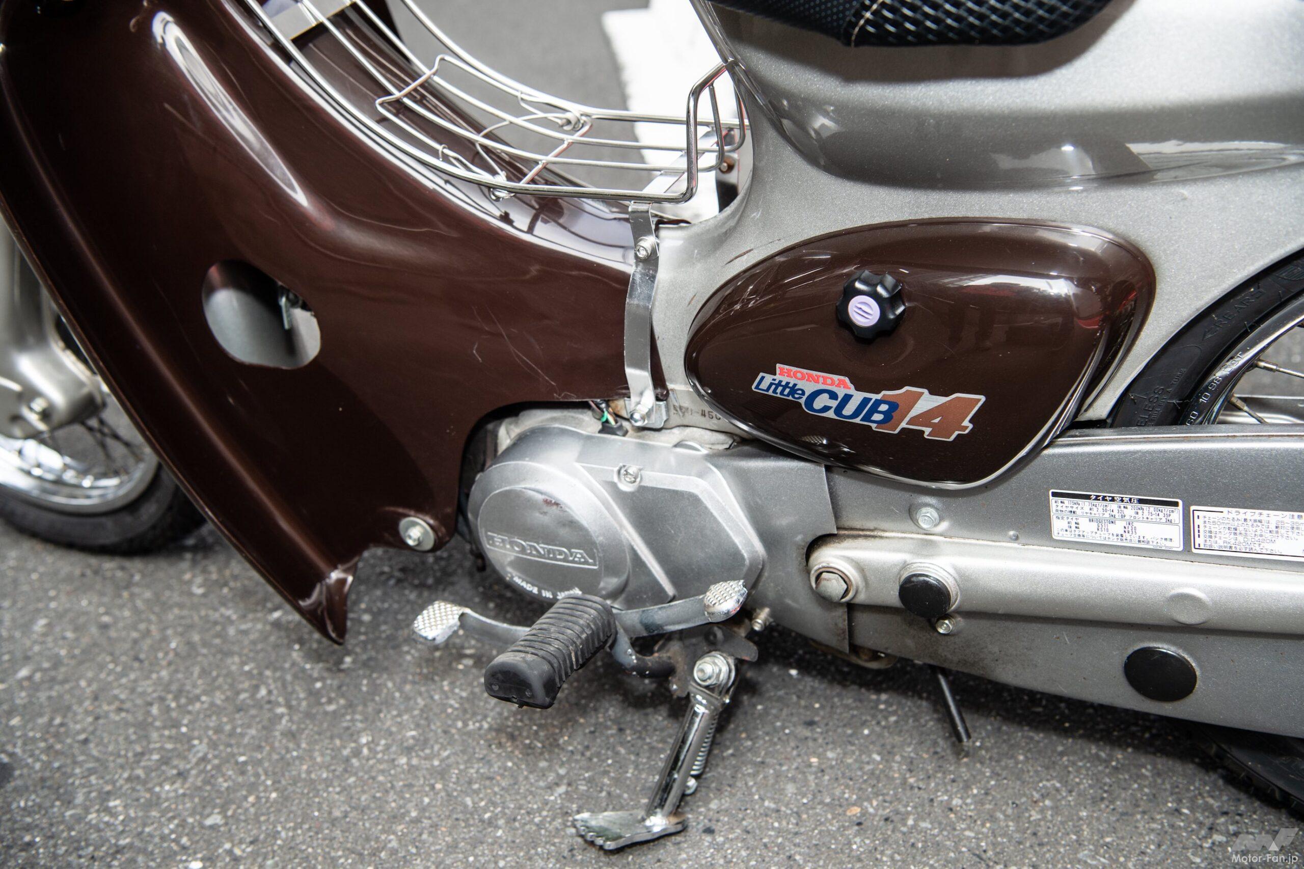 ローダウンの手法はいたって簡単。フロントはフォークを分解して短くカットするショート加工を施した。フロントのカット分に合わせてリヤにはローダウンサスペンションを組み込む。これだけのことだが、ただでさえ14インチタイヤで低く見えるリトルカブがさらに低く構えた姿になる。前後ともタイヤがフェンダーに隠れるほどローダウンしているので、当然のようにサイドスタンドが長くて使えなくなる。そこでショートタイプの社外品に変更した。これでも「走れる車高短」だそうだ。
