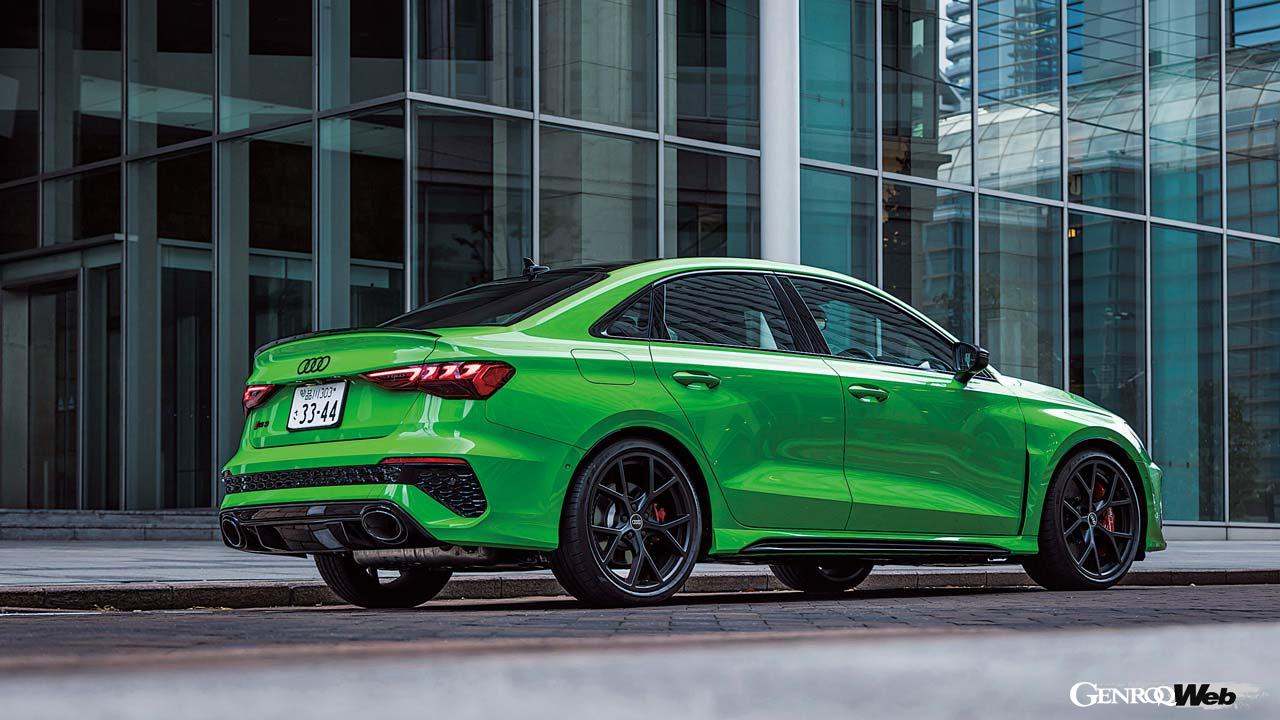 A3のボディに2.5リッター5気筒ターボとクワトロを詰め込んだ超速コンパクトアウディ……という基本的な成り立ちは、新しいRS3でも踏襲される。動力性能は400PSの最高出力こそ変わらないものの、最大トルクは先代から20Nm上乗せされて500Nmの大台に達した。
