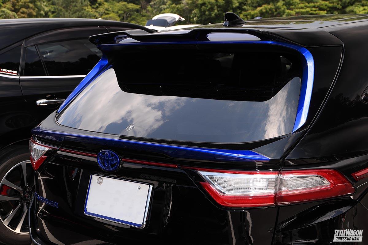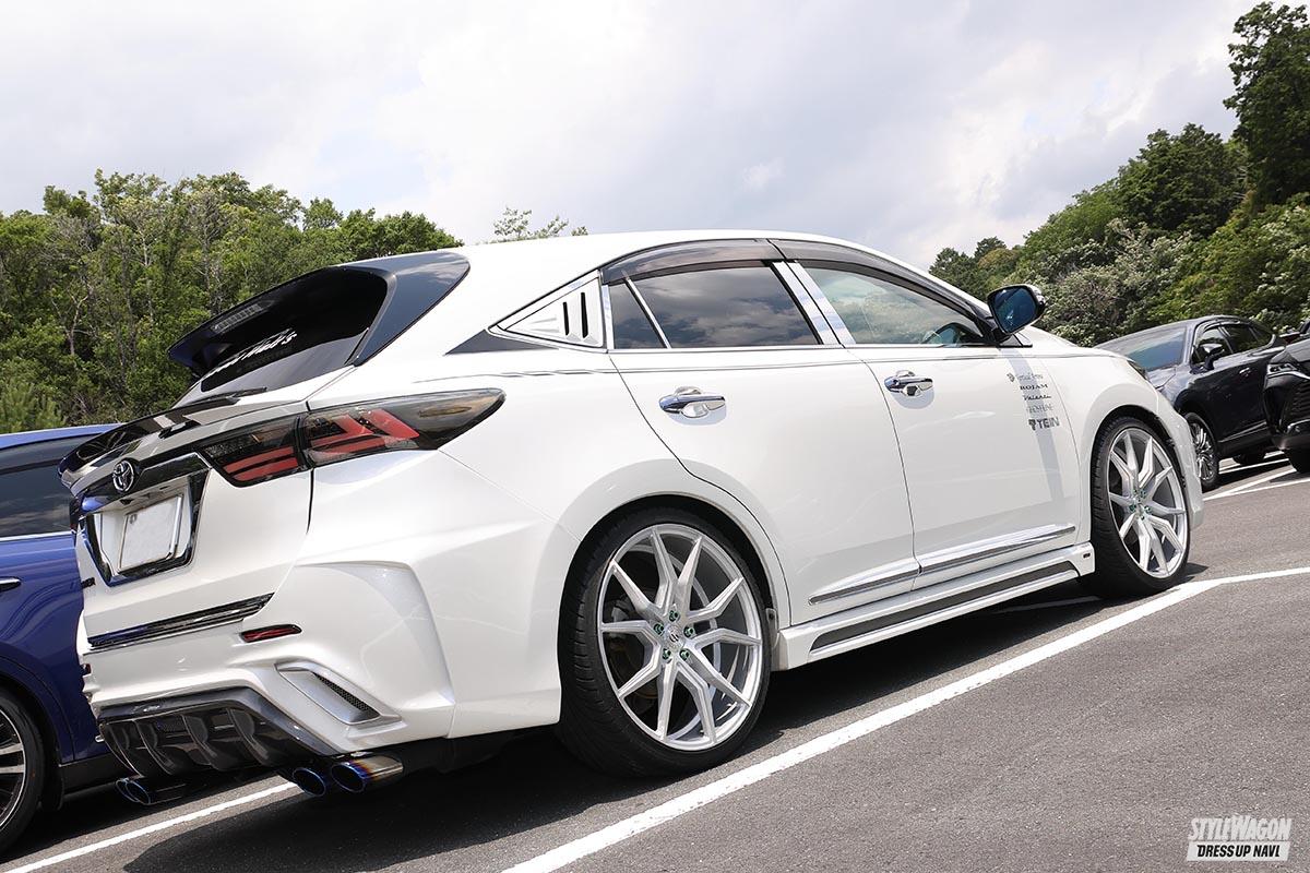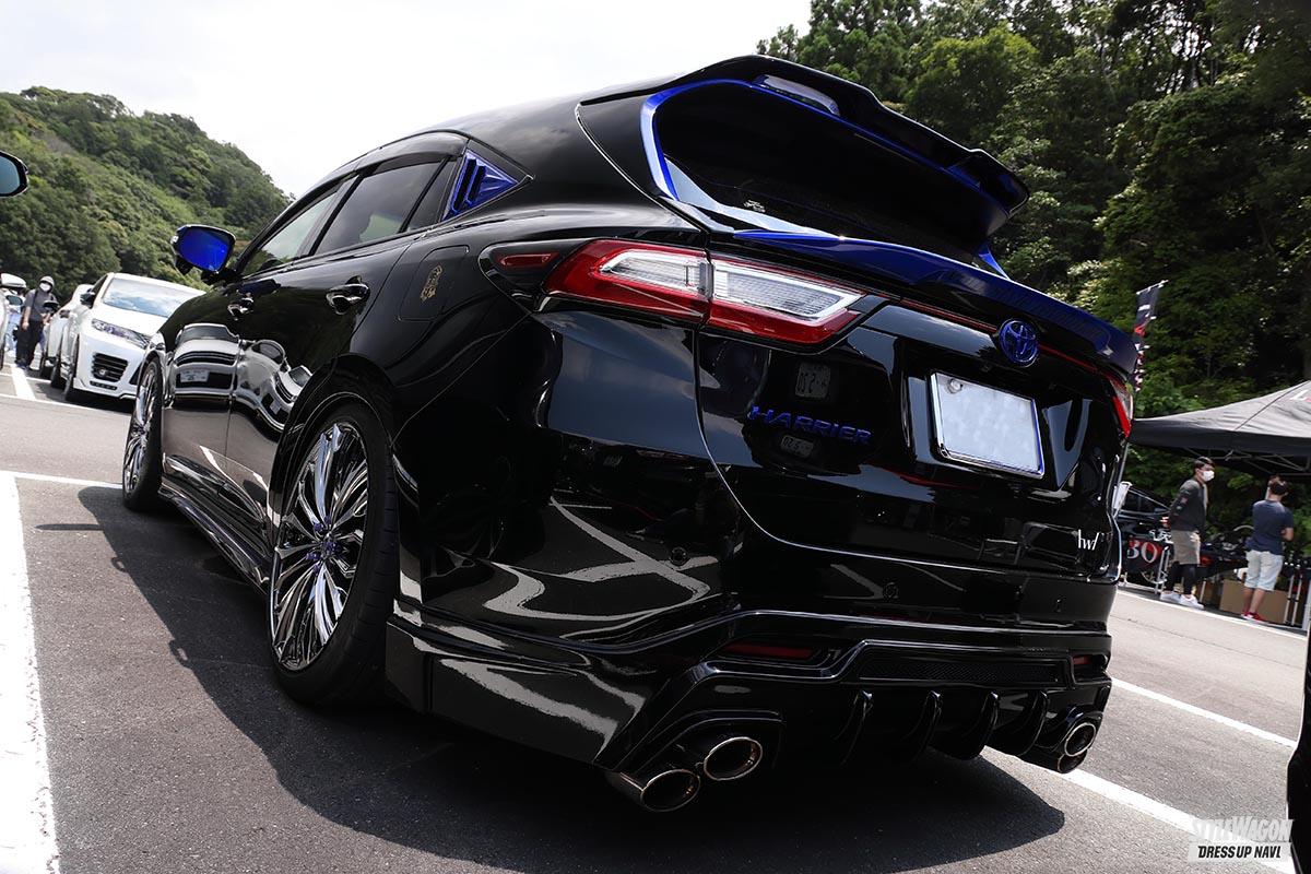 会場内でひと際異彩を放っていたTRIPLEXXXさんのハリアー。ハリアーのドレスアップでは“下げ路線”が定番だが、当車は“上げ路線”だったのだから! 「家族でキャンプに行くので、実用的なクルマにしよう」と思ったそう。元々は奥様のフォレスターで遊びに行っていたのだが、今ではより行動範囲の広いコチラで出掛けるとか。確かにリフトアップも相まって、どこへでも行けそうな雰囲気だ。内装にも見どころがあり、グラージオの張替えで総合的に仕上げていた。パーツを外して送り、加工してもらったそう。濃い付き合いがあったのだが、「この日初めてグラージオの社長と会った」とのこと。社長も実車を見られる感慨ひとしおだった……ハズ!