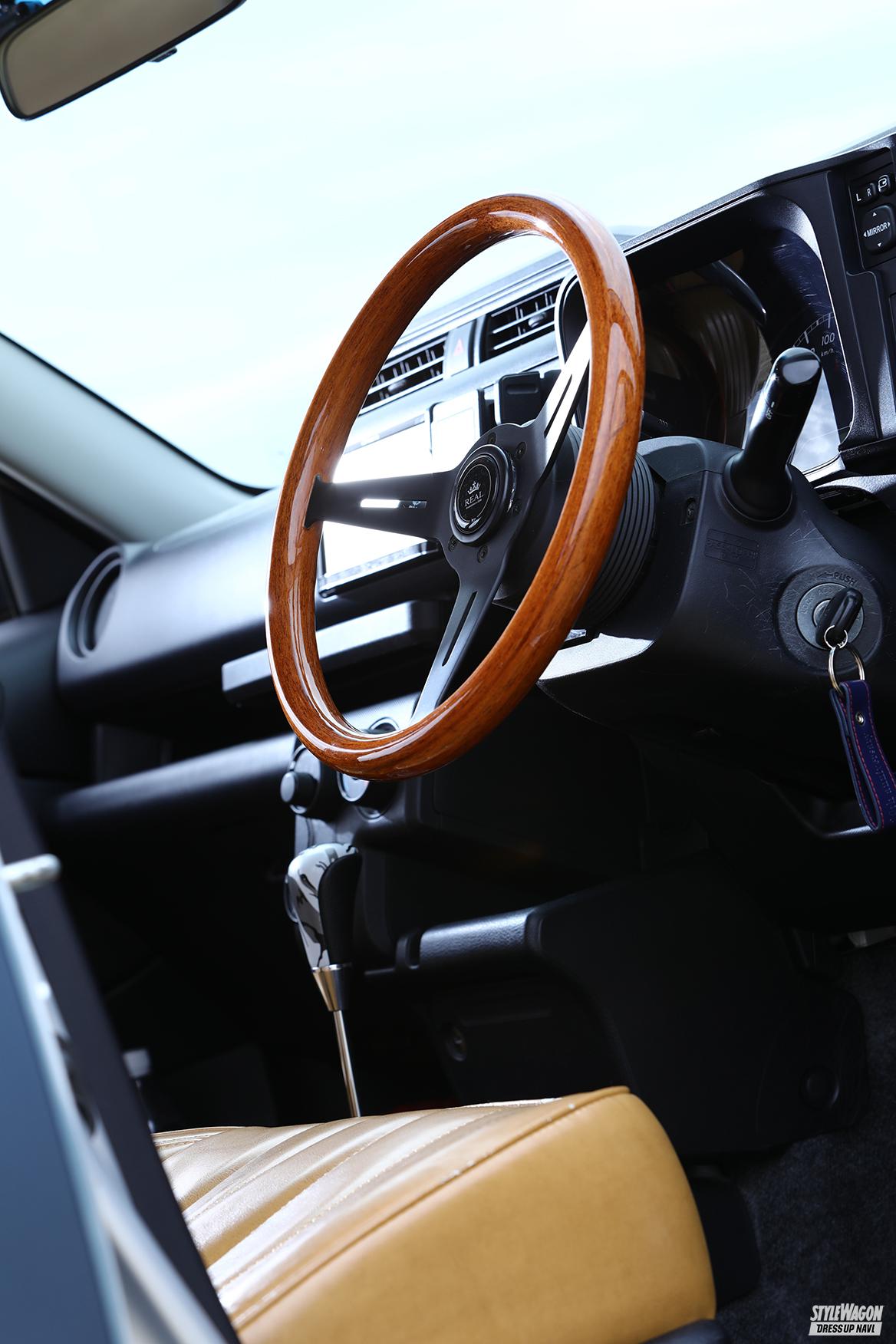 レトロなウッドステアリングが、アウトドア気分を盛り上げます! どこにでもいる営業車をカジュアルに! 遊びクルマにカスタマイズします! 【プロサクSTYLE UP PROJECT/第5回】