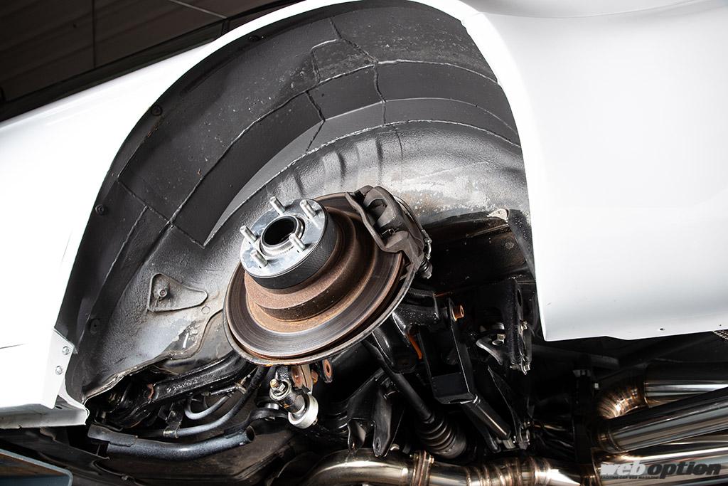 ストラットはユニバーサルエアのエアバッグと326パワーのダンパーを組み合わせた仕様で、ロワブラケットの取り付け位置をかなり下げて装着。ドライブシャフトを撤去して、FR駆動としているのも特徴だ。