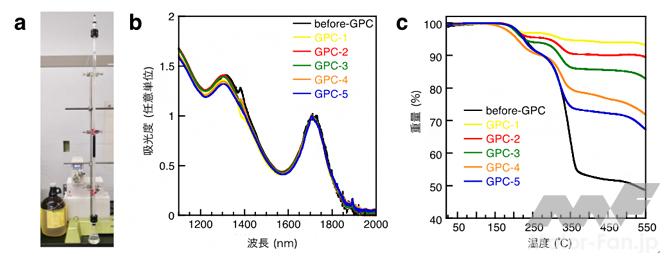 次に、ゲル浸透クロマトグラフィー(GPC)法(溶離液:トルエン、移動相:架橋ポリスチレンビーズ)を用いて、量子ドットの配位子密度の制御を試みた(図1a)。量子ドット溶液をGPCのカラムに流し込み、溶離液を一定時間・一定体積で分画する。溶出してくる順に量子ドットをGPC-1~GPC-5、GPC未処理の量子ドットをbefore-GPCと呼ぶことにした。それぞれの量子ドットの吸収スペクトルを測定したところ、before-GPC、GPC-1~GPC-5の全てにおいて、1,710nmに吸収ピークを示した(図1b)。この結果から、GPC法によって分画された量子ドットは、溶出順によらず全て同じバンドギャップを持つことが分かった。つまり、GPCによる分画では、量子ドットを粒径の違いで選別していないことになる。透過型電子顕微鏡(TEM)[8]を用いた観察でも、6種類の量子ドットは全て同じ大きさであることを確認した。