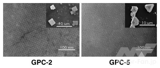 配位子が少ないGPC-2では四角形状の超結晶と正方配列した結晶表面、配位子が多いGPC-5では三角形状または六角形状の超結晶と六方配列した結晶表面を示した。