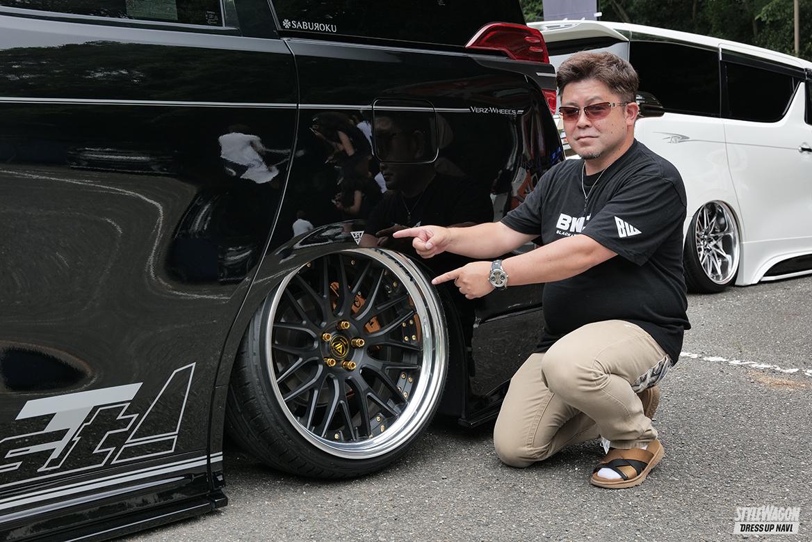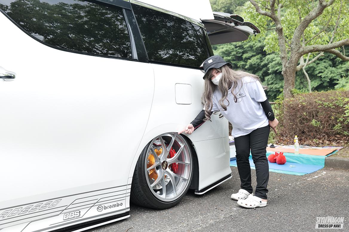 カスタムに詳しく無いという人が見ても、この車の足元は凄いと分かると言えるほど、圧倒的な存在感を放つシオ(・U・)さんのアルファード。地元企業だからと選択したホイールはBBSのRI-D。カラーはダイヤモンドシルバー。超超ジュラルミン製の鍛造ホイールは見るからに軽量で、走りに対するこだわりをも感じる。車全体のイメージにも影響を及ぼす程インパクト大の足元だがエアロやエアサスなどで上手くトータルコーディネイトされている。