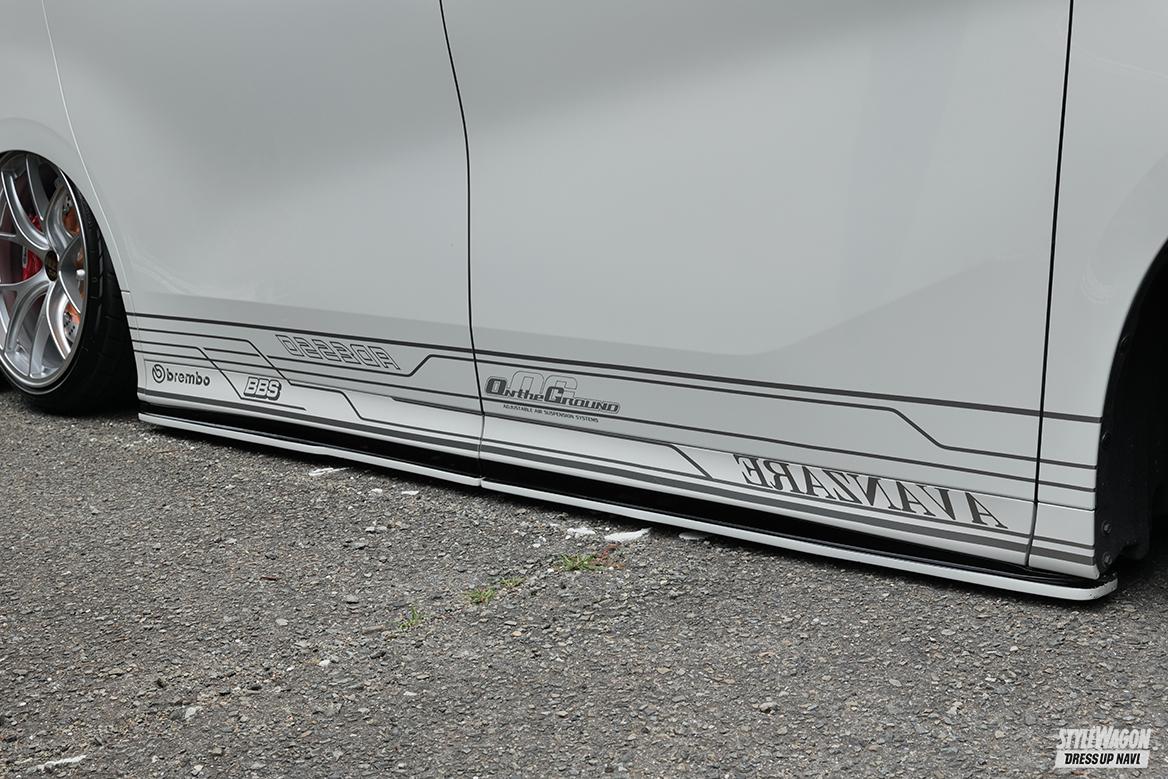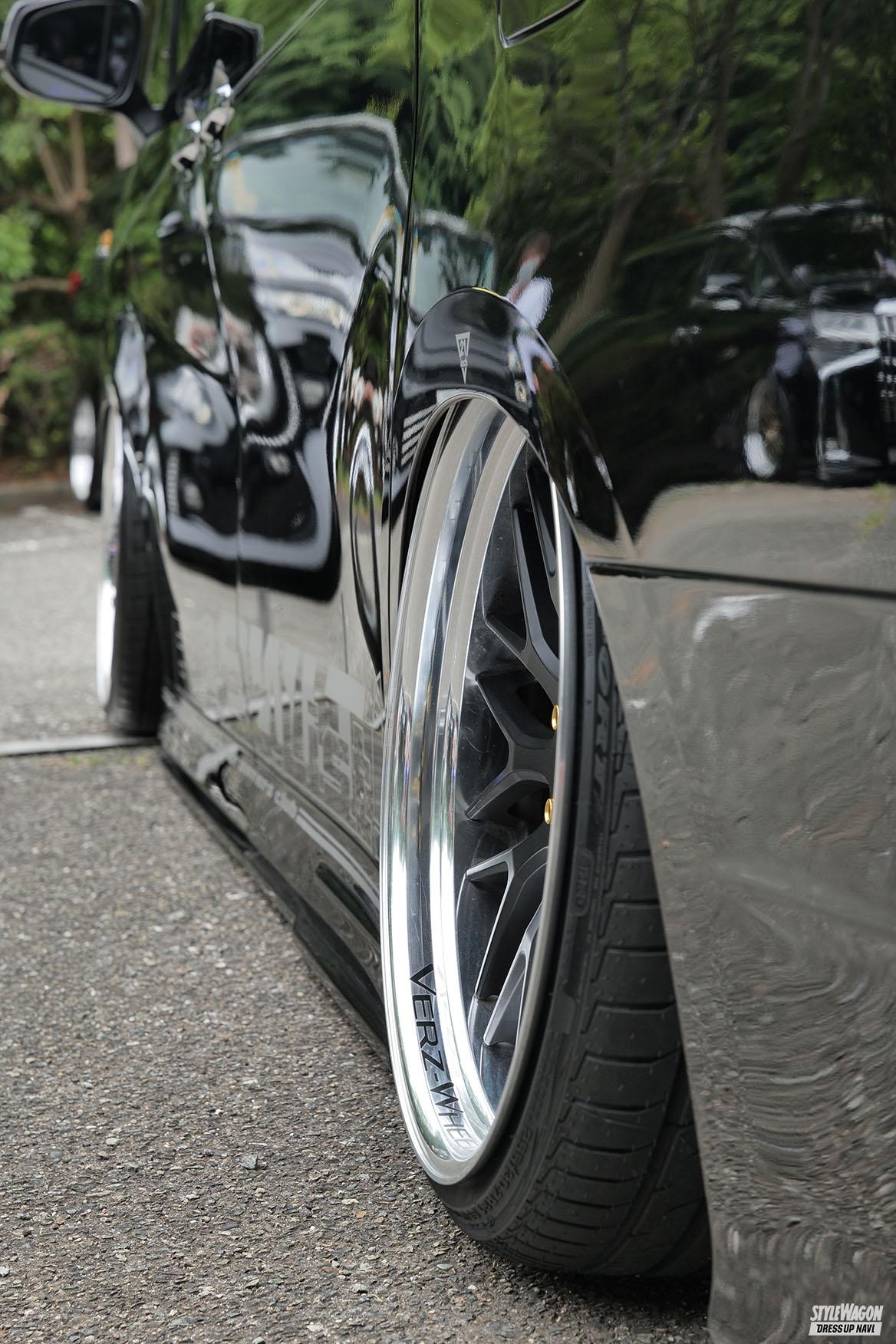 車両をコンプリートで購入したのだがその際にはホイールは含まれていなかったらしく、エアロ着地と程よいキャンバーを意識してホイール選びしたという。そして選んだのはヴェルズホイールズKCV-01の21インチ。色は全体のイメージを考えてマットブラックを選択した。目論見通りにACCのオンザグランドでエアロ着地時には綺麗なキャンバー角を見せ、フロントリアともにフェンダーがリムまで被る。更に驚きはこの車はウェルキャブ仕様。着地時にもスライドドアは使用できるのだ。
