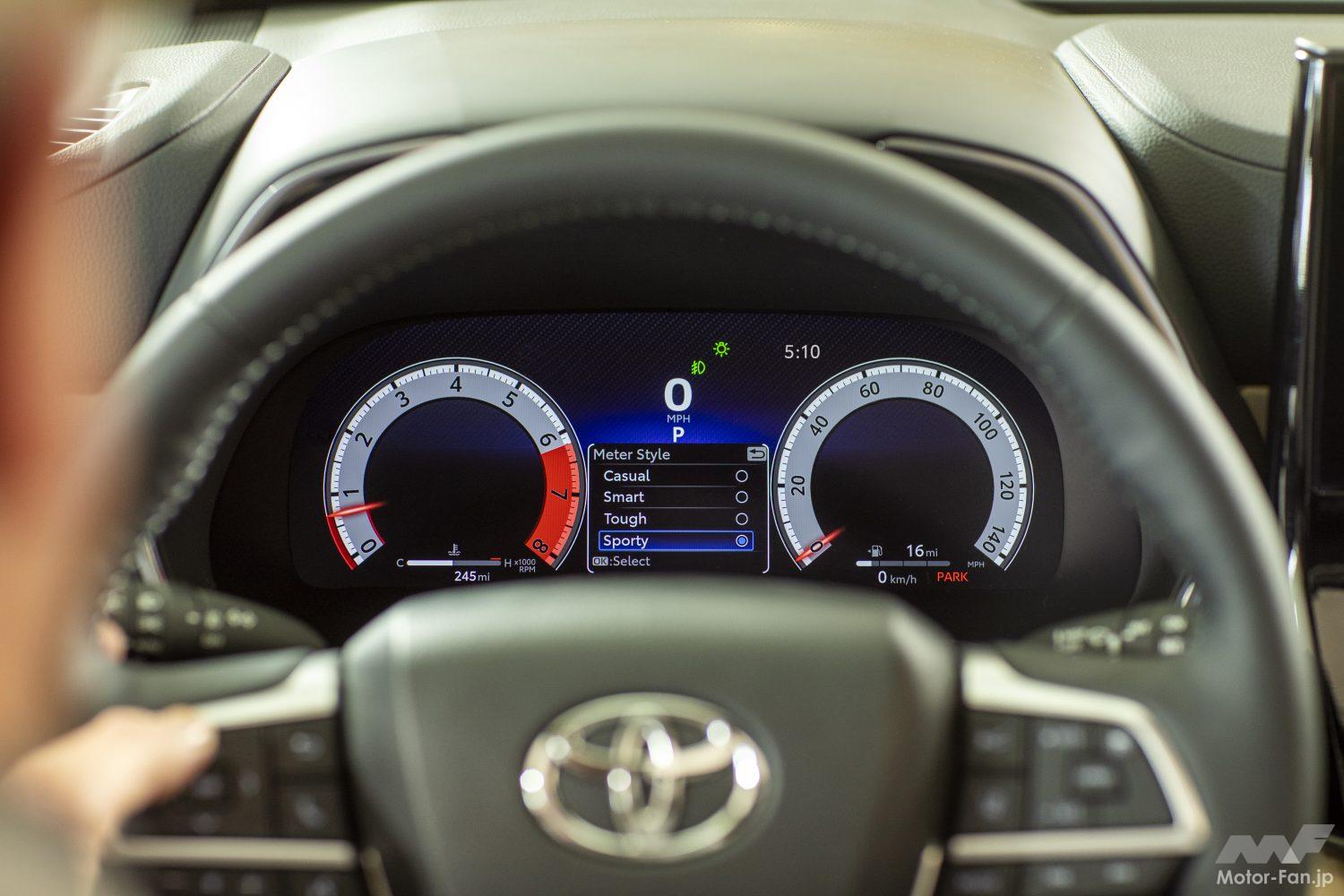 2023年型ハイランダーのラインナップのうち、「Limited」と「Platinum」グレードには12.3インチのマルチインフォメーションディスプレイが2画面、標準装備されている。従来の7インチTFT液晶に代わり、新たに12.3インチのフルデジタル画面が装備され、4種類のビジュアルモードが追加されている。「カジュアルモード」、「スマートモード」、「タフモード」、「スポーティモード」の4つのモードが用意されている。オーディオマルチメディアでは、デュアルBluetooth電話接続を可能にし、標準でApple CarPlayとAndroid Autoに対応している。