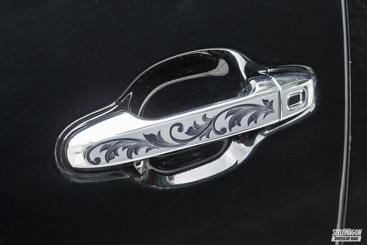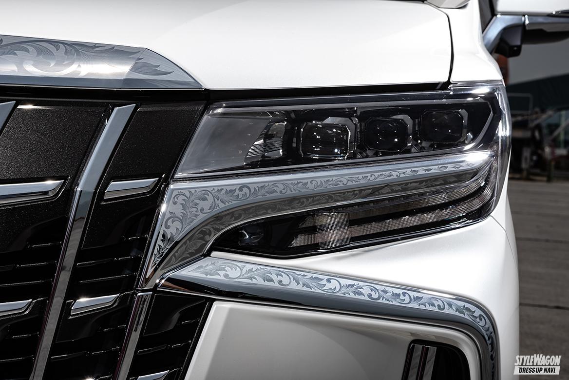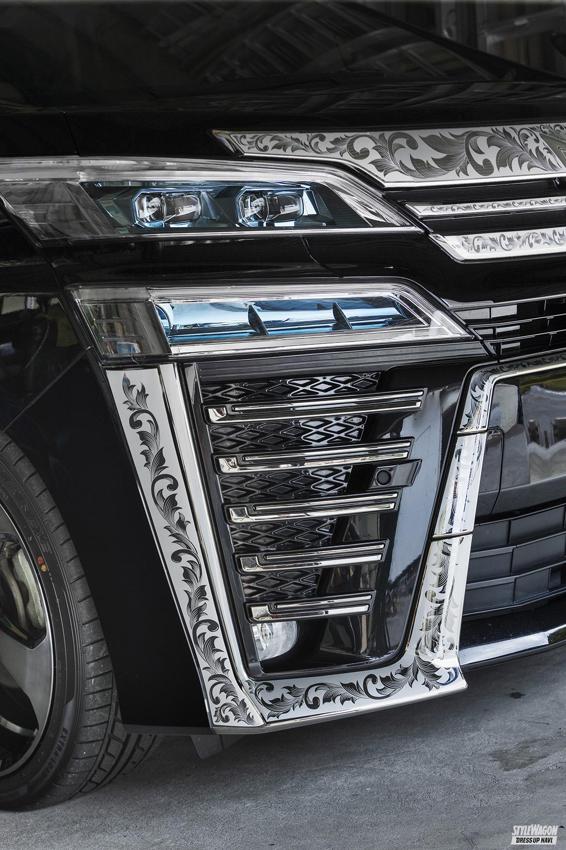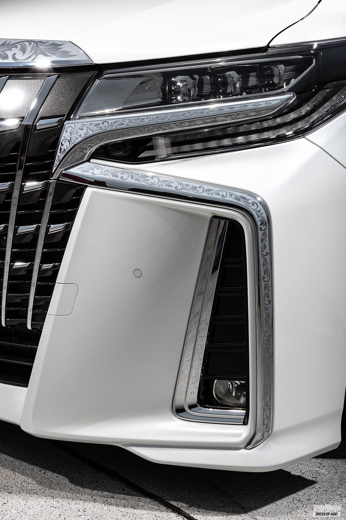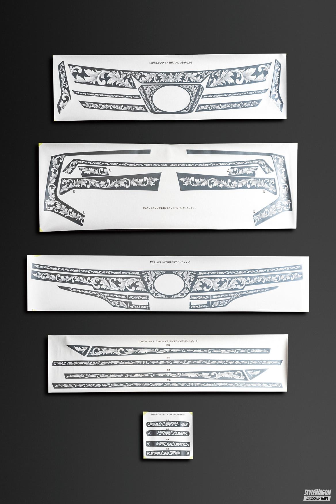 前後、サイドとボディ全体に採り入れられている純正メッキを、手軽に、賢く、そしてリッチに彩れるとして話題を集めている「プレカットデカール」は、文字通りの貼りモノ系。高級家具や食器などで見られる彫刻的技法である「エングレービング」柄を、極薄かつ高耐候性のクリアフィルムに印刷したパーツだが、アルファード&ヴェルファイアはご存じの通り高級車。純正メッキの割合が多いため、ボディ各部を特別なエングレービング柄でアレンジするとかなり効果的だ。