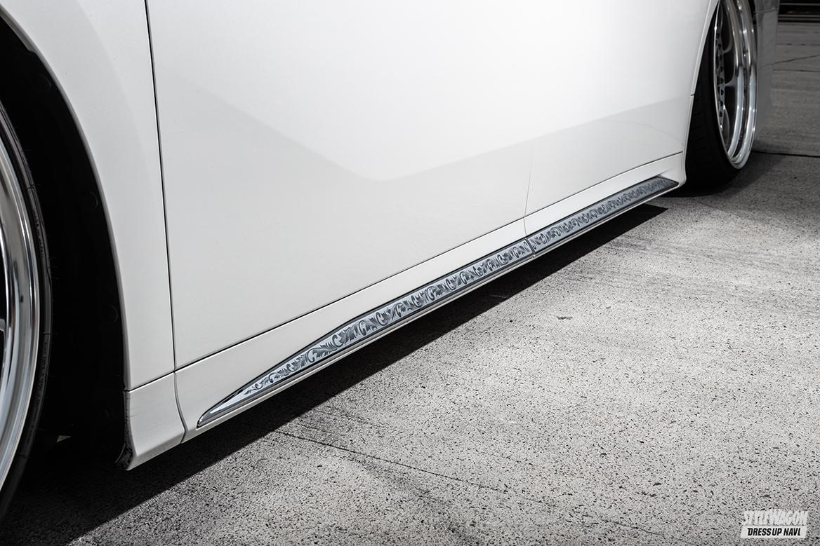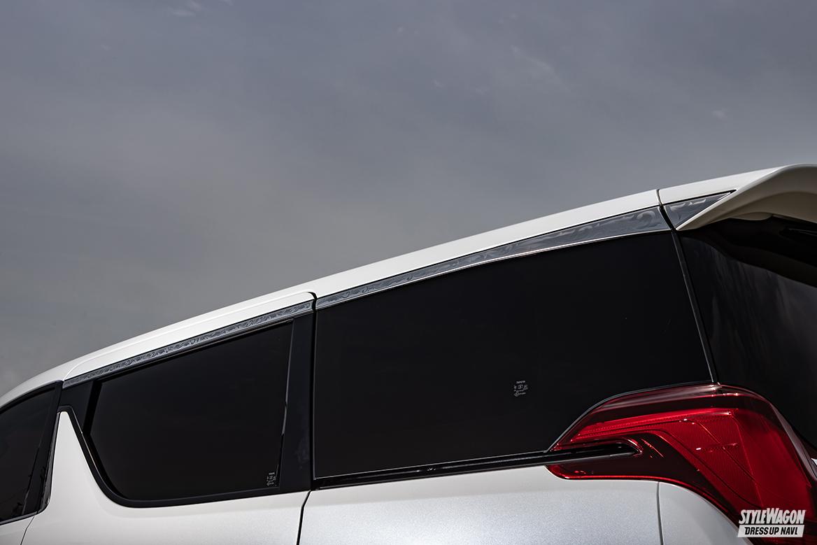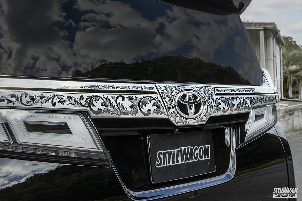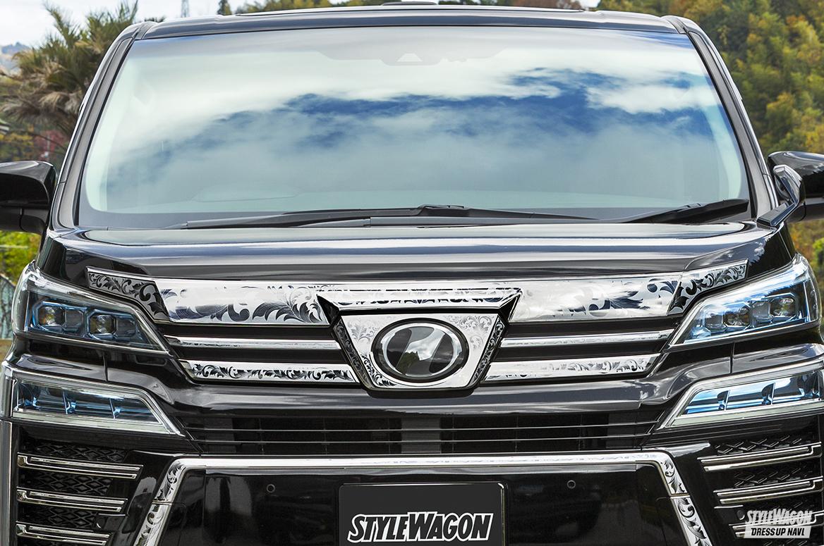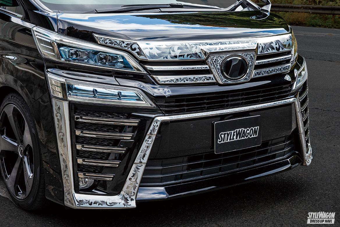 前後、サイドとボディ全体に採り入れられている純正メッキを、手軽に、賢く、そしてリッチに彩れるとして話題を集めている「プレカットデカール」は、文字通りの貼りモノ系。高級家具や食器などで見られる彫刻的技法である「エングレービング」柄を、極薄かつ高耐候性のクリアフィルムに印刷したパーツだが、アルファード&ヴェルファイアはご存じの通り高級車。純正メッキの割合が多いため、ボディ各部を特別なエングレービング柄でアレンジするとかなり効果的だ。