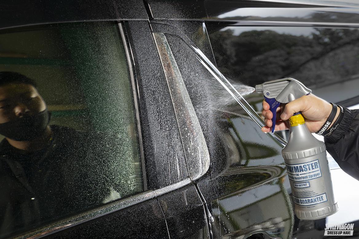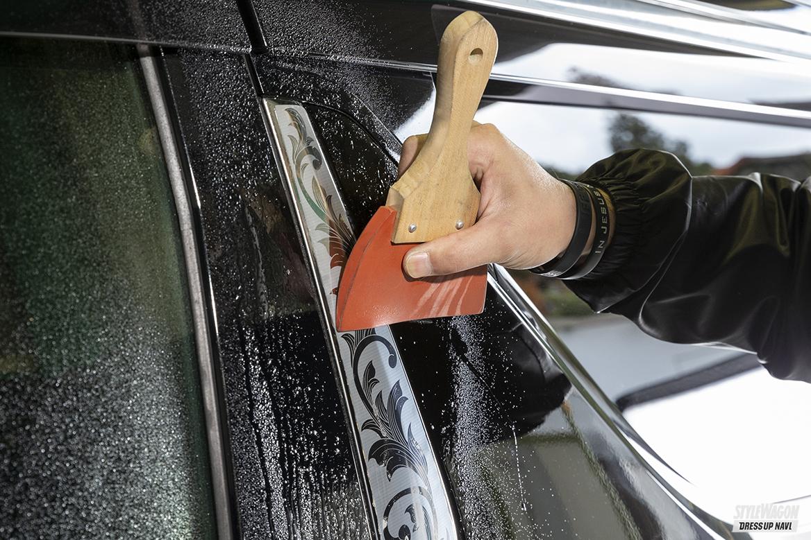 石けん水や脱脂作業などが必要となるものの、ゆっくりやればビギナーでもDIYで貼り付けできる。キレイに貼るポイントは洗車と脱脂。しっかり下地処理を行っていればより長く楽しめる。水分を抜く、スキージと呼ばれるヘラも準備したい。
