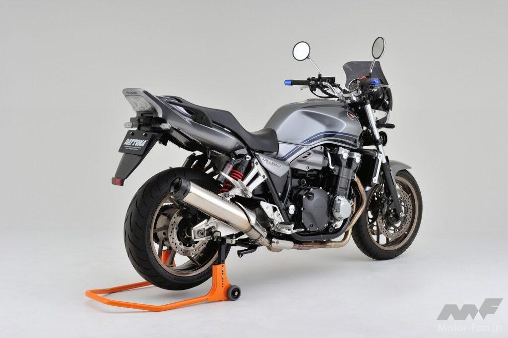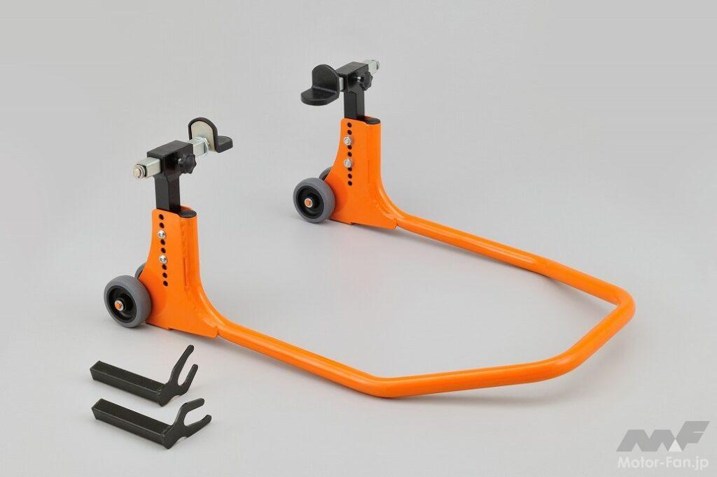 そんな一長一短のスタンドですが、社外のスタンドを用意すればもっと自由度が広がります。デイトナから新たに登場した「リアスタンド アジャスタブルⅢ」はリヤをリフトアップする定番のデザイン。レースシーンなどでも見たことがあると思います。