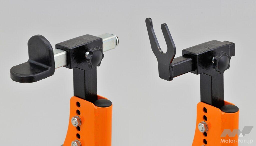 そして注目なので受け部分が一般的なL型(左)とU型(右:V型とも言う)の2つのアタッチメントを揃えていること。L受けは汎用性がたかく、スイングアームが平面の車両(パーツ形状)に使用でき、U受けは別売りのスタンドフック(スイングアームスプール)を使用することでしっかりと車体を保持できるようになります。