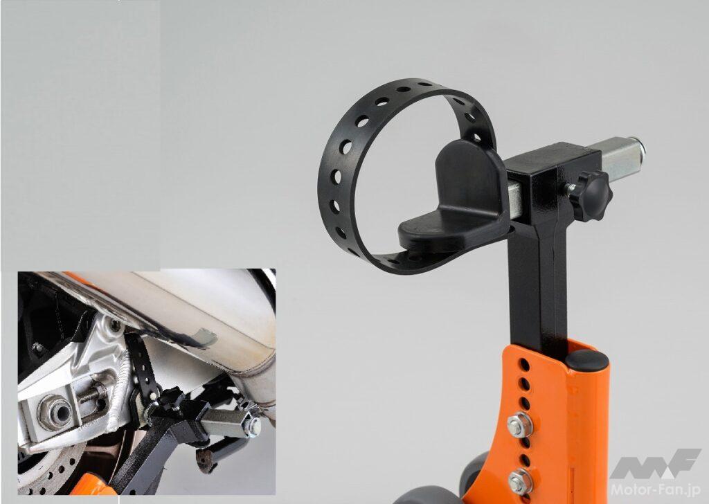 アタッチメントに装着されているゴムバンドをスイングアームに巻くことでリアスタンドを固定することができ、降ろした際にもスタンドが落下するのを防止できます。
