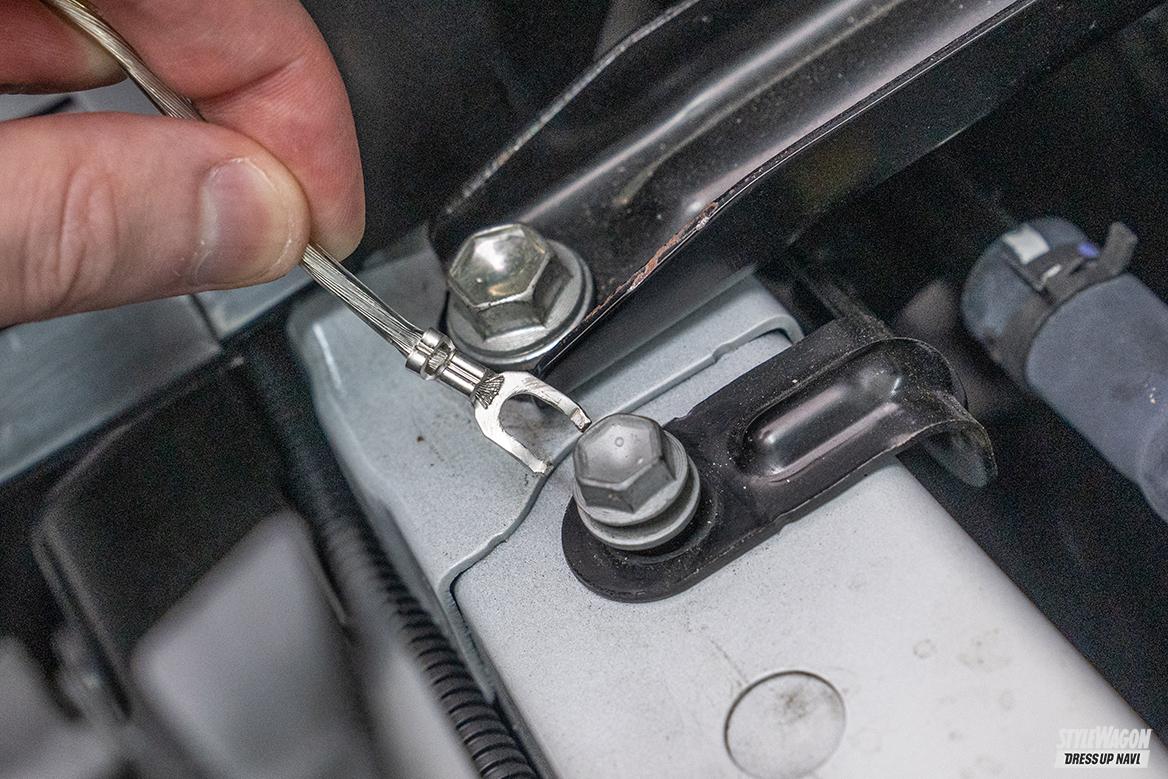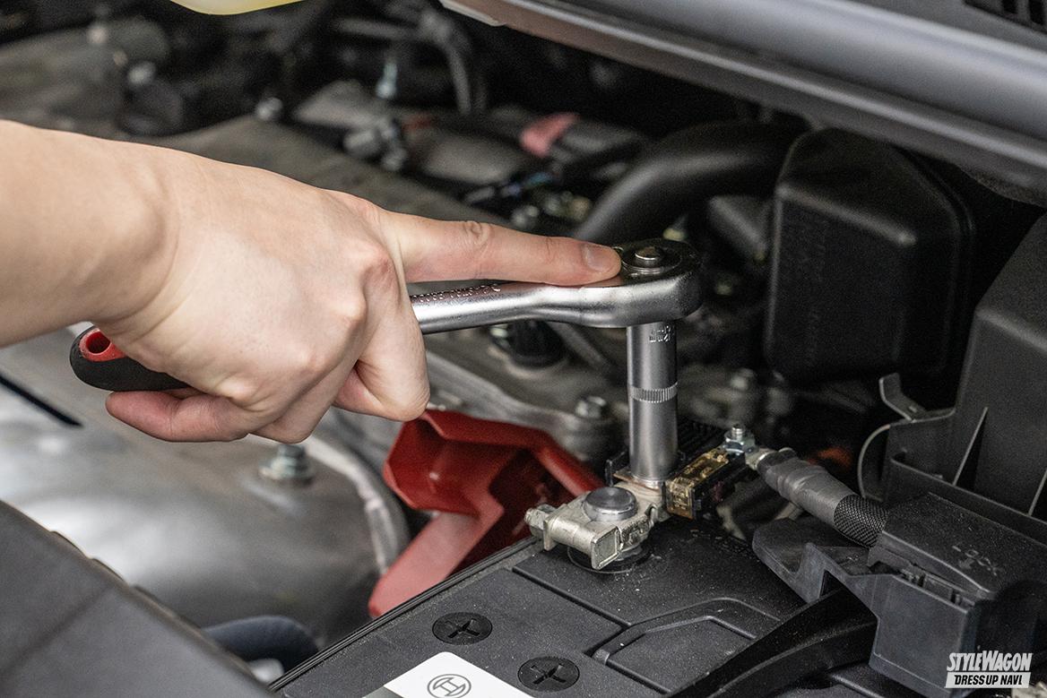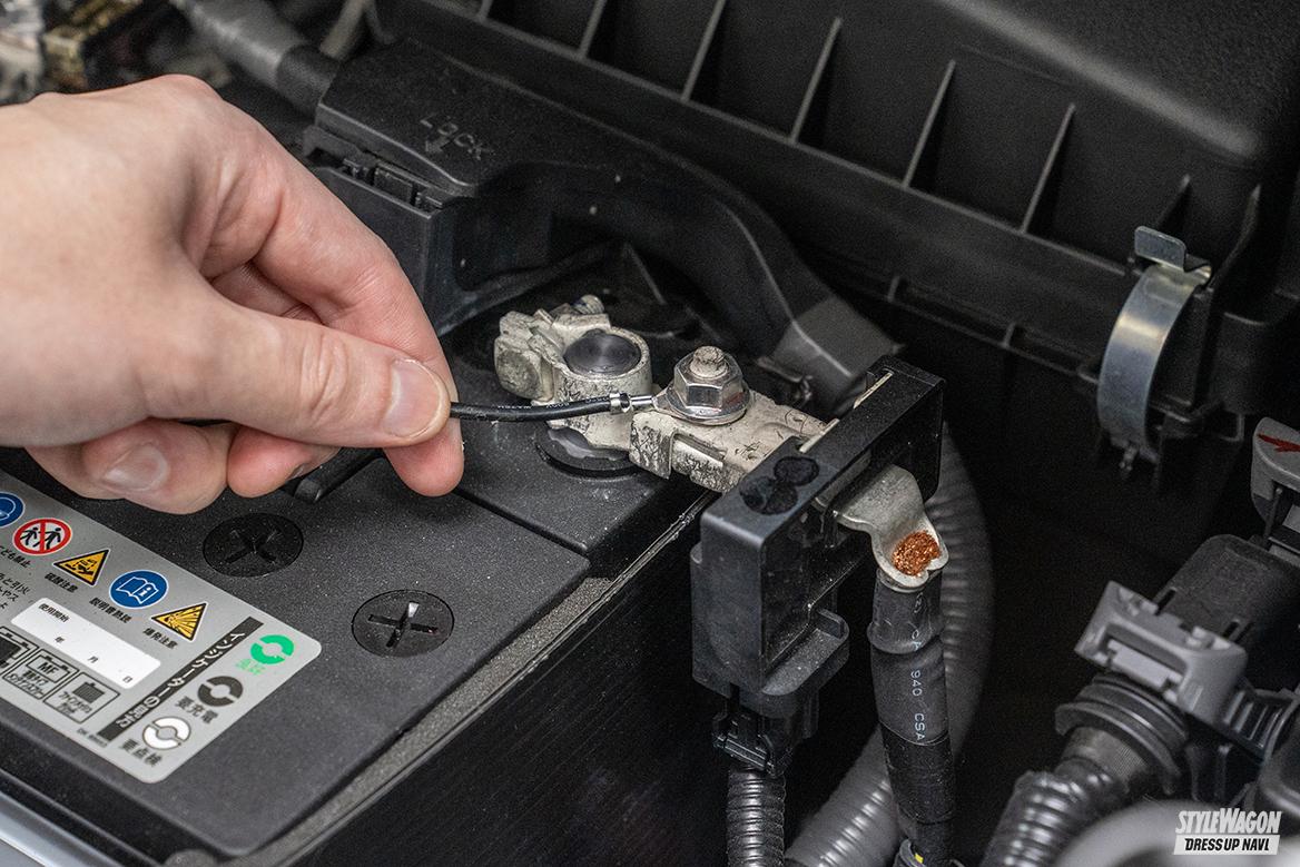 ①作業は必ずエンジンSWをオフにしてから行う。バッテリー等に繋がるボルトを緩めていく。②最初に赤いコードをバッテリーのプラス端子に、黒いコードをマイナス端子へと接続。③クリアのコードはボディの塗装面にあるボルトと共締め。銀色の配線を取り付ける際、未塗装の金属面と共締めすると、サビがその面に集中するので注意。④ヘビーデューティータイプなら、リア側まで配線を伸ばすことも可能。配置はバッテリーの上やエンジンルームの空いたスペースに付属マジックテープで取り付けよう。