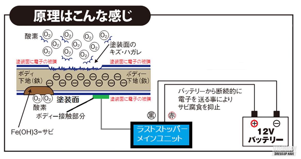 鉄板部分が露出することでそこに水分が付着。その際、鉄と水がイオン化し空気中の酸素と結合することでサビが発生。これを防ぐためにラストストッパーを装着すると、本体からボディ(鉄板)へ向け電気を流すことで、酸素を付着を阻害しサビの発生を遅らせる。