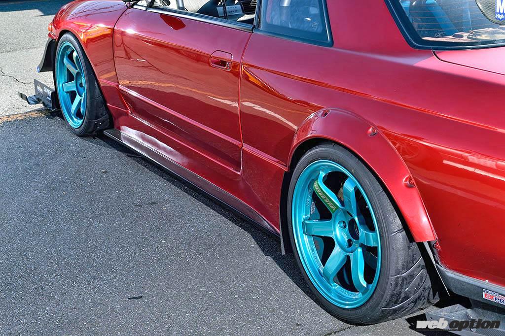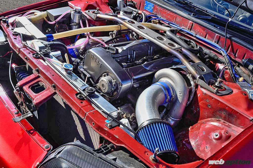 マシンメイクを担当しているのは、千葉県の“テクニカルファクトリーブラインド”。エンジンはHKSのステップ1キットを軸にしたRB26改2.8L仕様で、タービンにはボルグワーナーのS300をセット。設定ブースト圧は1.5キロ(600ps)だが、後々は1.7キロまで上げていく方向でセッティングを進めているという。エンジンマネージメントはフルコンのLINKが担う。