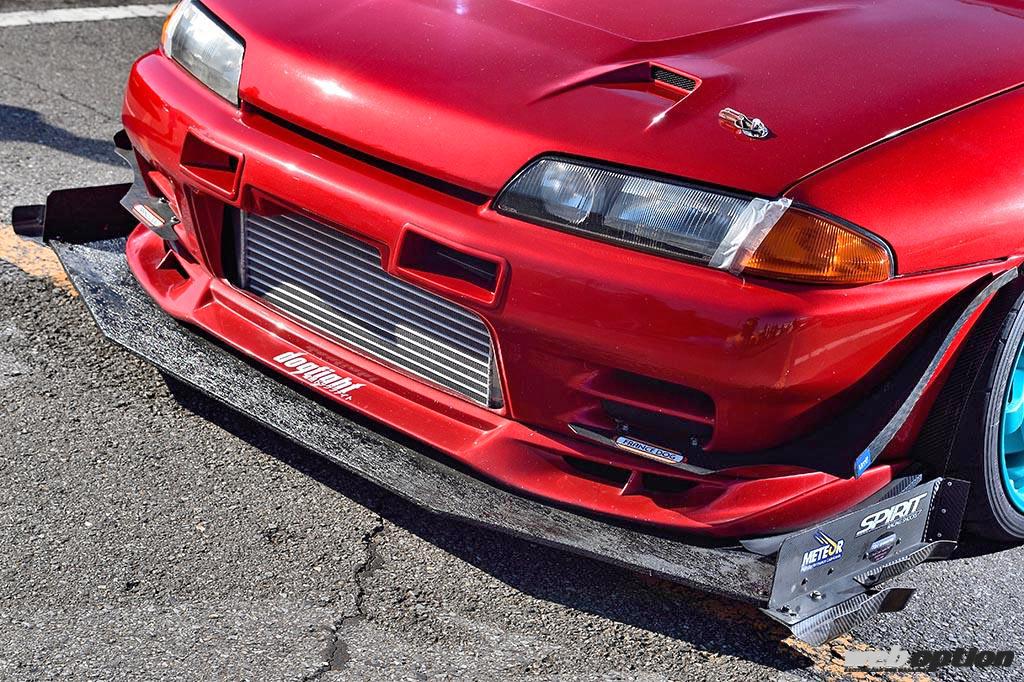 エアロパーツを見ていく。フロントはBNR32純正バンパーにショーリンのフロントリップ、フィーストのカナードをセット。ボンネットは高勢スタウト製だ。リヤセクションは、SARDの汎用GTウイング”020”とトップシークレットのディフューザーでダウンフォースを増強。リヤバンパーは純正品にダクトを設け、パラシュート効果の低減を図っている。