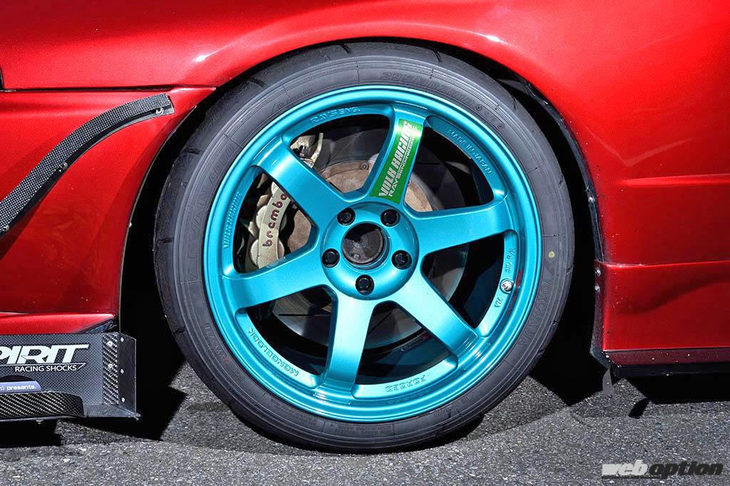 ホイールはボルクレーシングTE37SL(11J+18)で、タイヤは295/30-18サイズのアドバンA050。当然、純正のナローボディでは収まらないサイズとなるので、フェンダーはフロントにGT-R純正を、リヤには汎用のオーバーフェンダーを装着することで対応している。