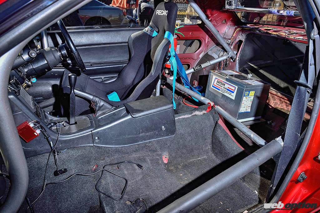 室内は運転席のみというスパルタンなシングルシート仕様。ロールケージはサイトウロールケージの製品をベースに、ワンオフの補強バーを各部に追加している。ドライブトレインはミッションをホリンジャーの6速シーケンシャルタイプに変更。クラッチはORCのトリプルタイプという組み合わせだ。