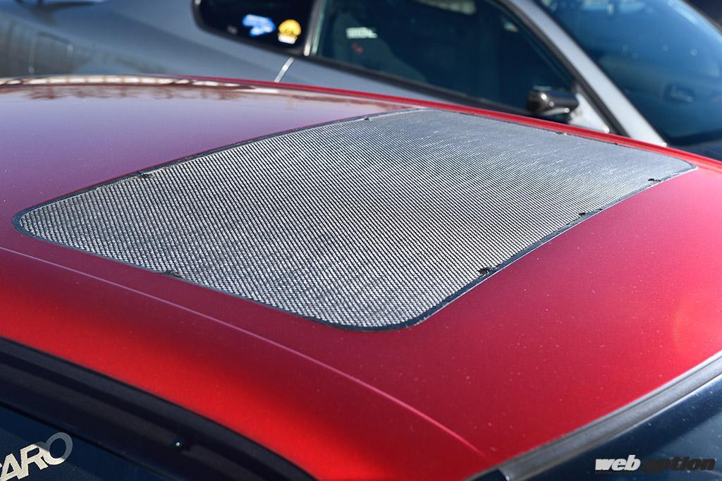 ちなみにベース車はサンルーフ付きだが、完全に撤去した上でオーナー自ら切り出したドライカーボンパネルにて塞がれている。取り外された純正サンルーフの重量は約15kg、はめ込んだドライカーボンパネルは1kg。軽量化による運動性能の向上に寄与していることは言うまでもないが、見た目のインパクトも絶大だ。