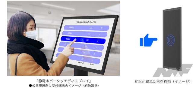 サイズは、15インチ程度の中型から、55インチ程度の大型まで、幅広く展開が可能。店舗のセルフオーダー端末、公共施設・商業施設の受付端末や案内用デジタルサイネージなどに搭載することで、さまざまなシーンにおける“非接触”ニーズに応える。そのほか、高い水準の衛生管理が求められる食品・薬品工場や手に油や汚れが付着しやすい生産現場などで使用する機器にも応用することが可能。