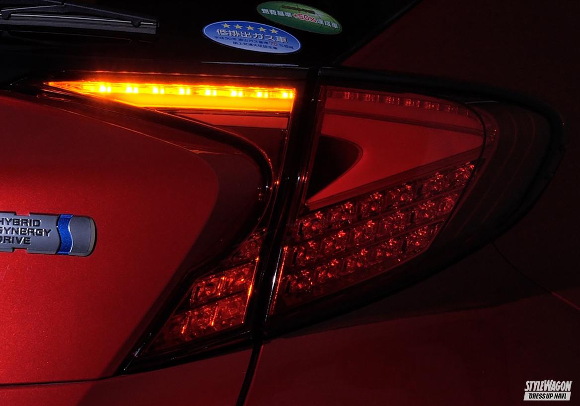 最新モデルは、C-HR後期型のハイグレードタイプテール装着車に対応。レンズ中央部に立体的なライトバーが配置され、最上部にウインカー、下部にブレーキランプを搭載。もちろんウインカーはシーケンシャル仕様となっている。鮮やかな光は、周囲の視線を惹きつけるとともに、リアビューの上質感を底上げしてくれる。レンズカラーはスタイルを選ばない2色を用意。後方からの視認性も高く、安全性も向上してくれる逸品だ。
