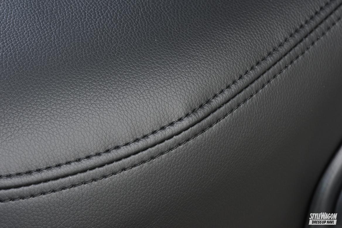 なんといってもその特徴は、クラシカルでスポーティな装い。ディンプル加工が施されたタックロールデザインのセンター部には、金属製のグロメットを配置。旧車を思わせるような懐かしさを感じさせつつ、今の時代には新鮮なスタイリングを実現している。もちろんクッション性や通気性も確保し、フロントシート背面にはシートポケットを装備するなど、実用面も抜かりなし。また、ヘッドレストキャッチ部の穴開け加工を施していないため、写真のような、よりレトロさを主張できるヘッドレストレスでも楽しめる仕様となっている。