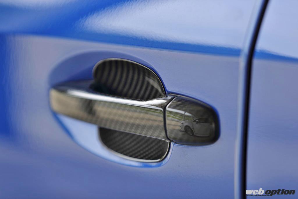 両面テープで貼るだけで、美しいカーボン柄を楽しむことができるカーボンドアハンドルカバー(2万9150円)&カーボンドアハンドルアンダーカバー(2万2000円)も用意。拘りのドライカーボン製で、クリア塗装済となっている。