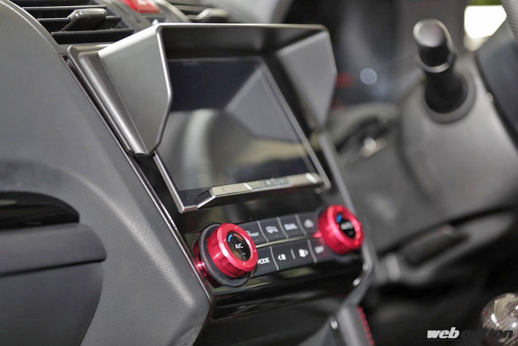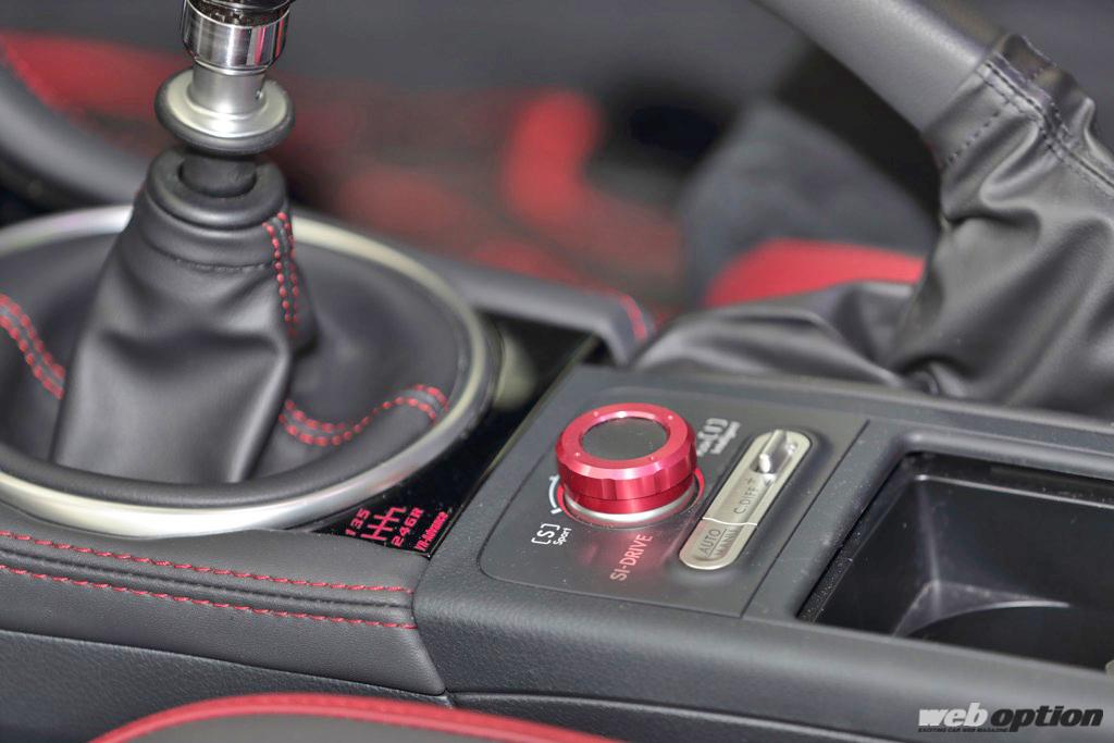 インテリアでは、エアコンのダイヤルにセット可能なアルミ削り出しのエアコンダイヤルカバー(1万3200円〜/D型用:1万2100円〜)は人気製品。レッドアルマイト仕上げの他、ブルーとカーボン調も用意されている。