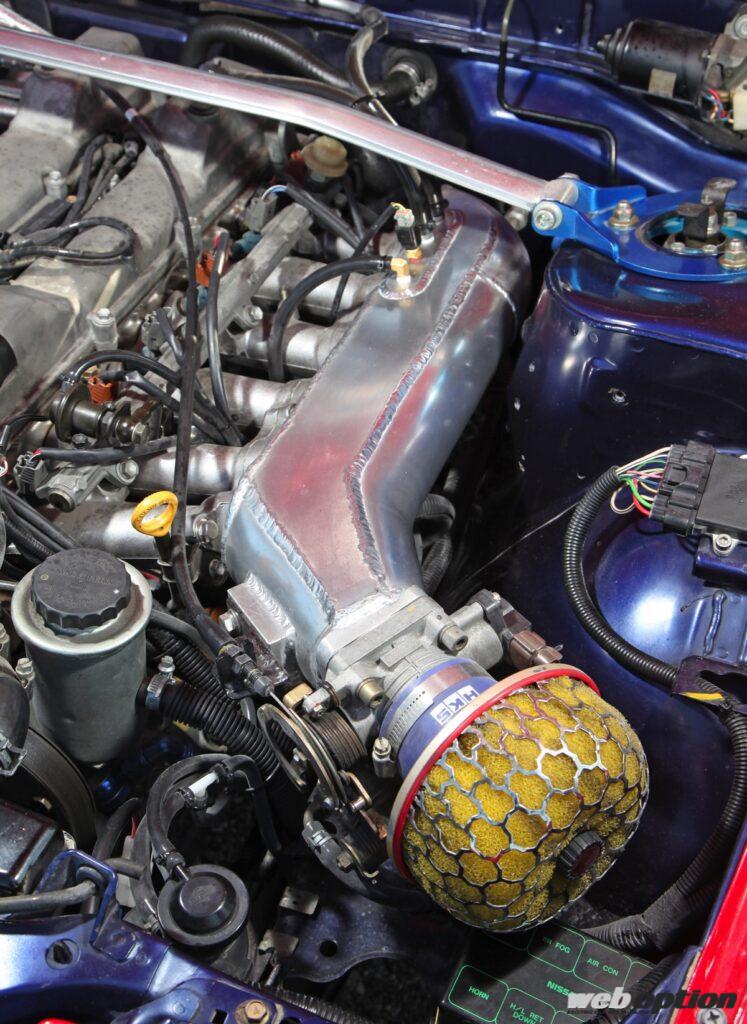 換装にあたっては、そのままだと吸気系のパイピングが邪魔でボンネットが閉まらなくなるため、サージタンクをワンオフで製作して吸気レイアウトを変更している。