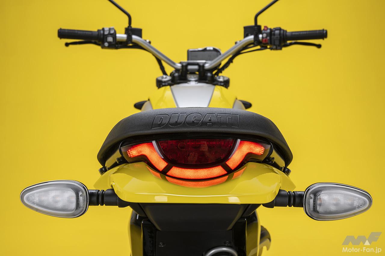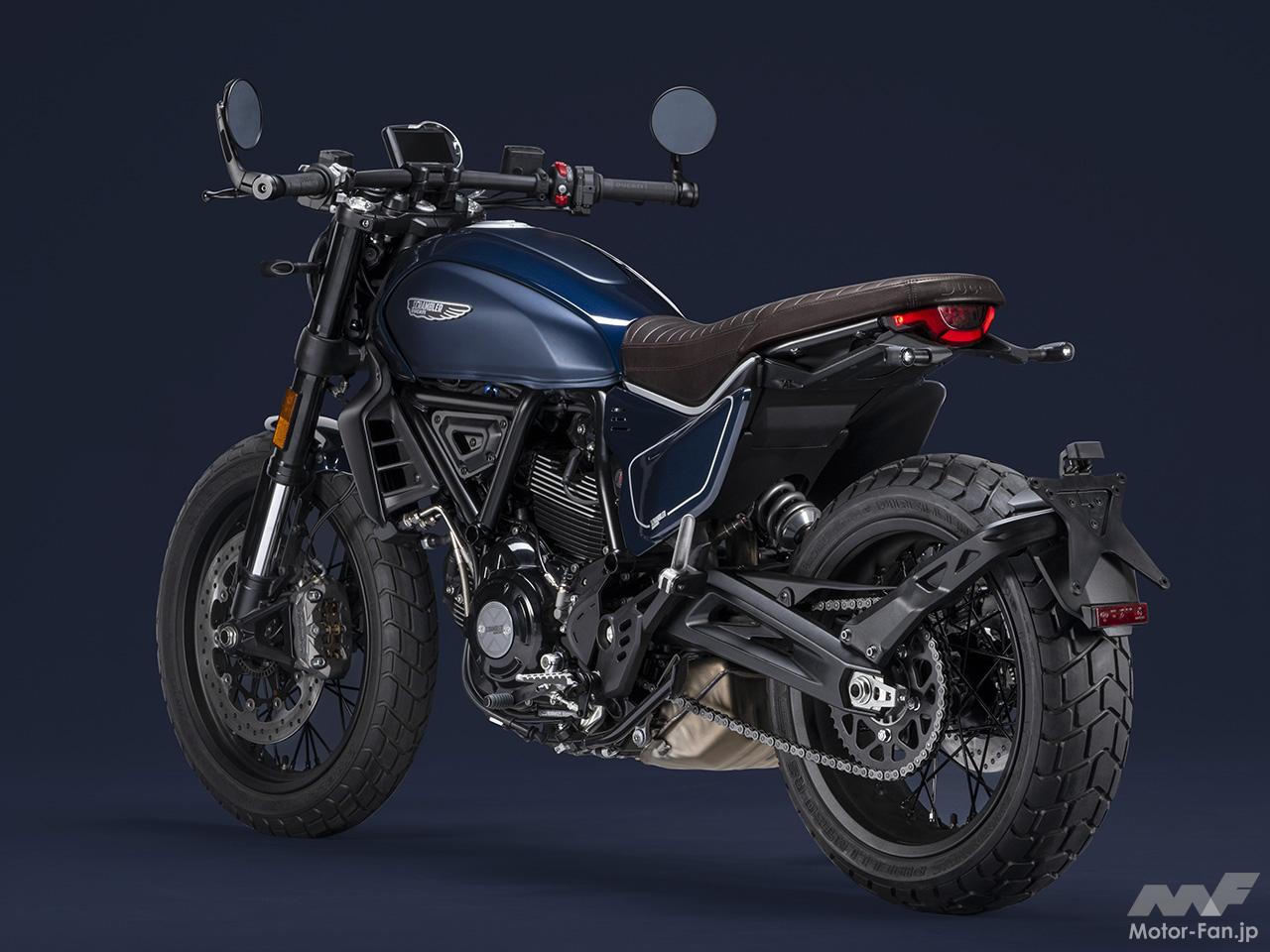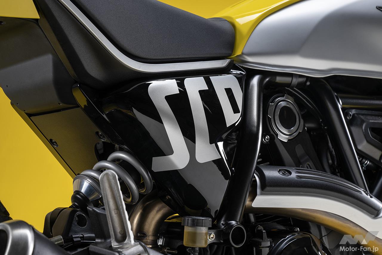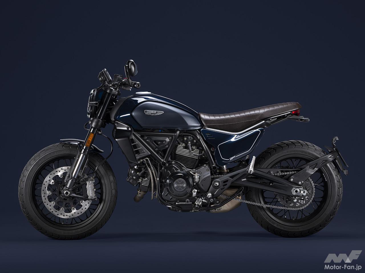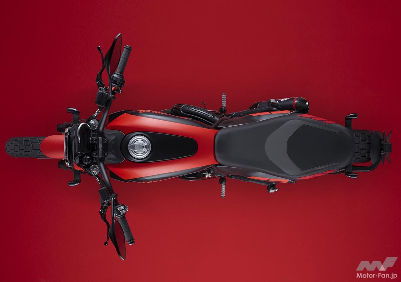 空冷4ストロークL型2気筒803ccのデスモドロミック2バルブエンジンを搭載したモデルは、2019年モデルより登場。今回発表された2023年モデルは、タンクやテールのデザインを一新。また、シャシーのベースとなるトレリスフレームとスイングアームも変更された。