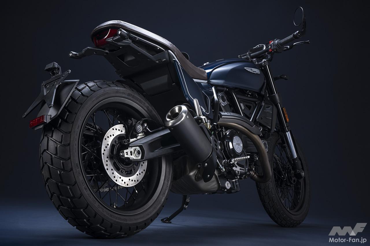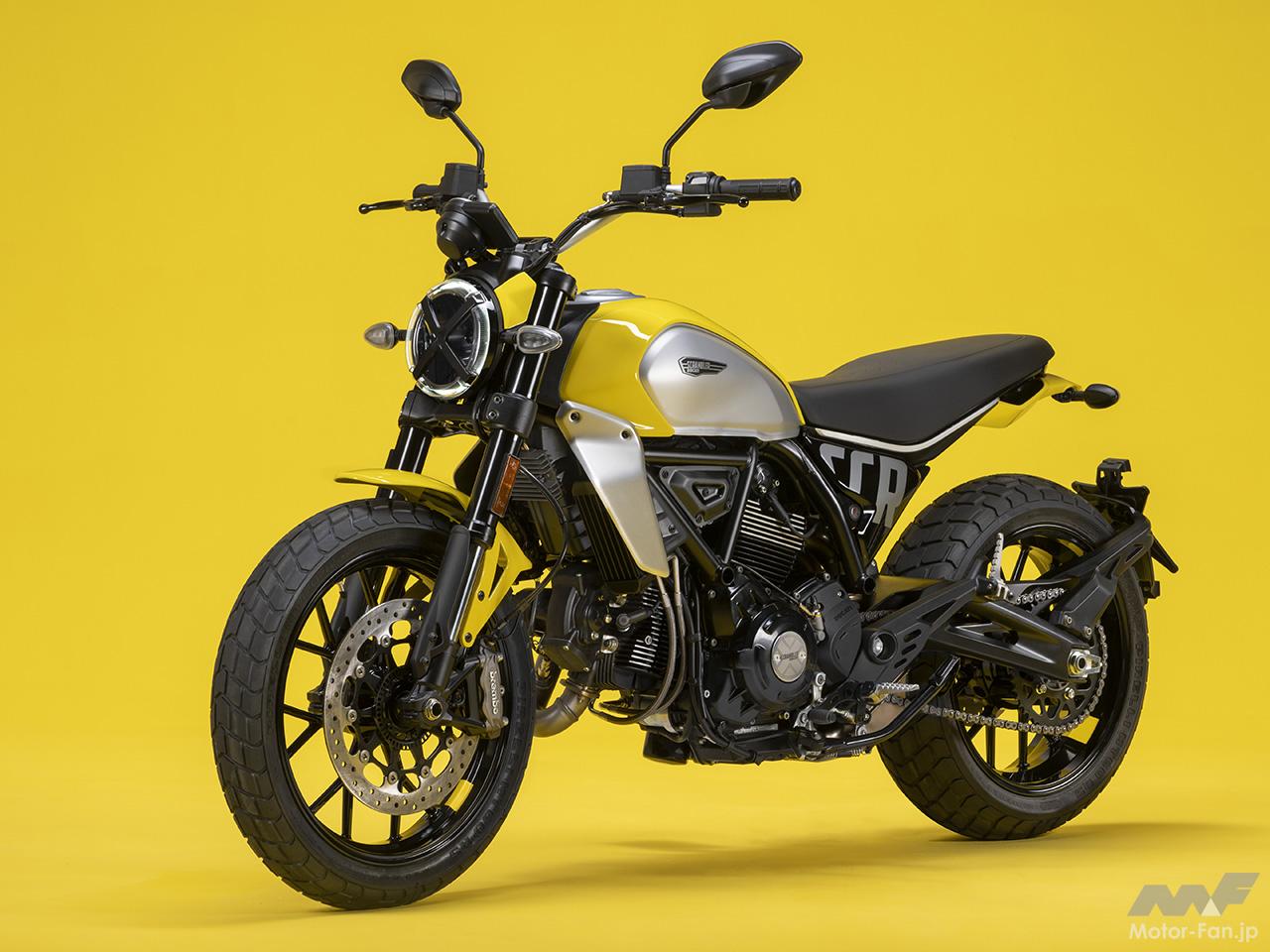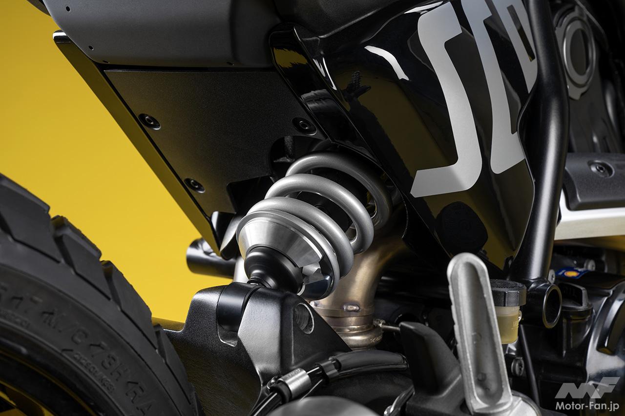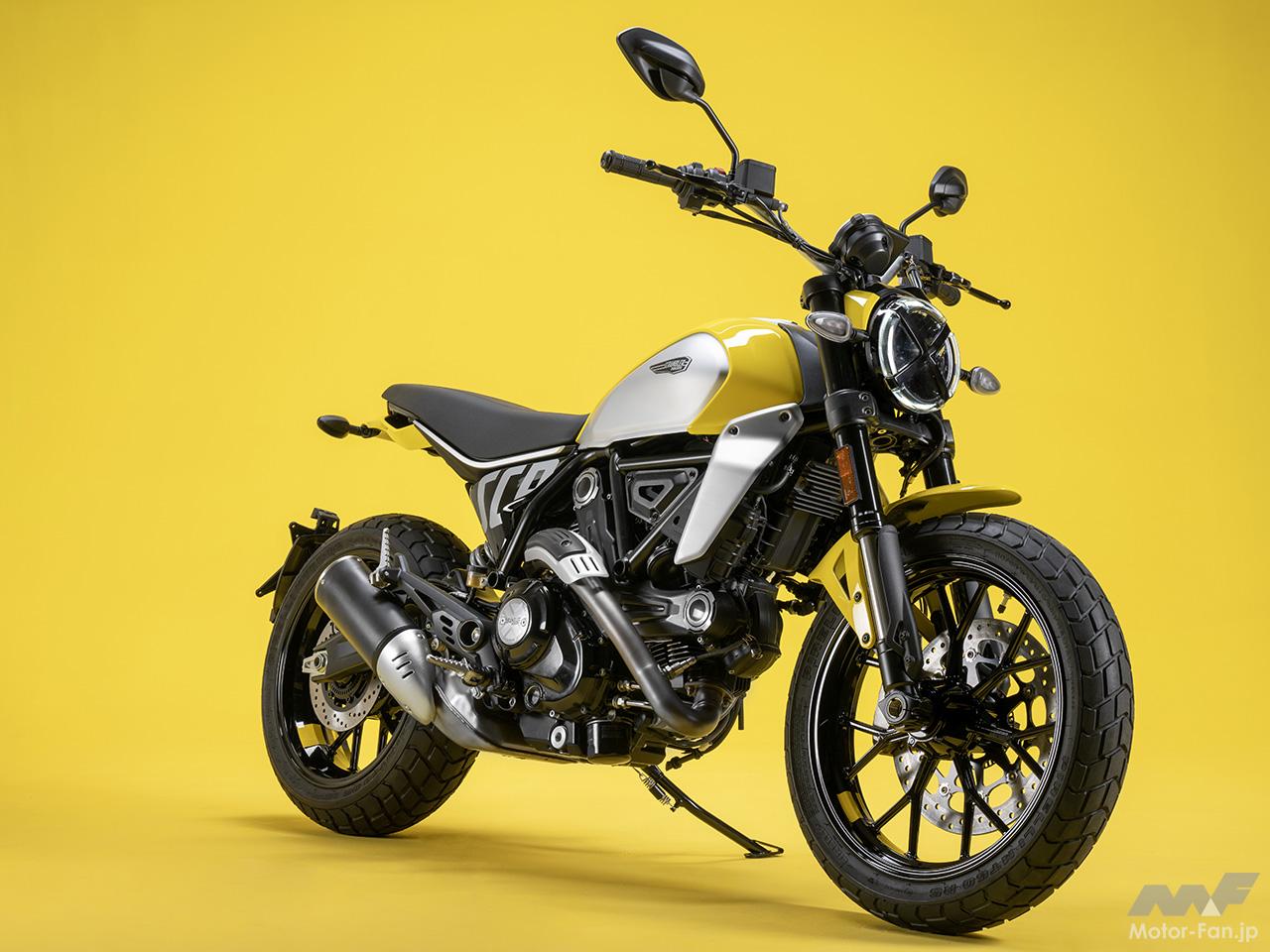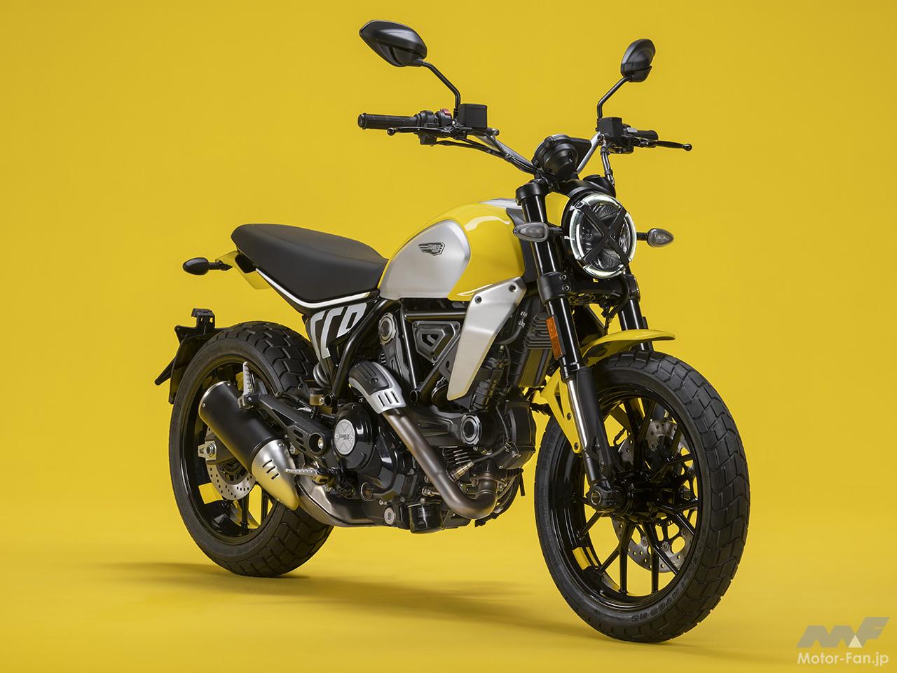 空冷4ストロークL型2気筒803ccのデスモドロミック2バルブエンジンを搭載したモデルは、2019年モデルより登場。今回発表された2023年モデルは、タンクやテールのデザインを一新。また、シャシーのベースとなるトレリスフレームとスイングアームも変更された。