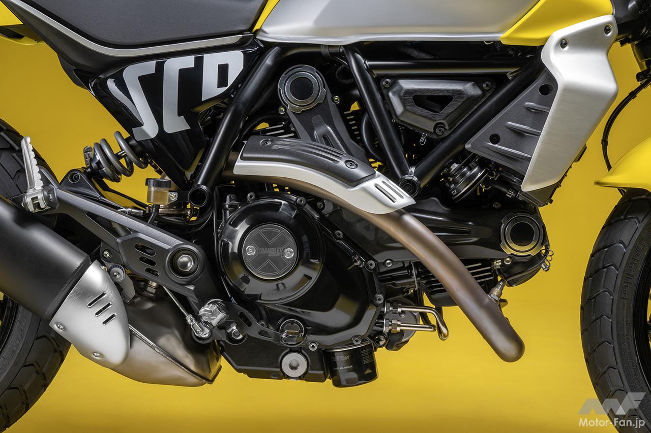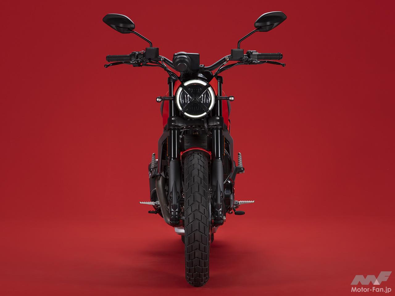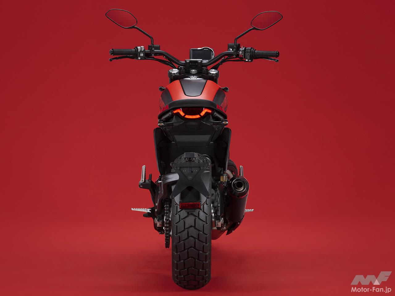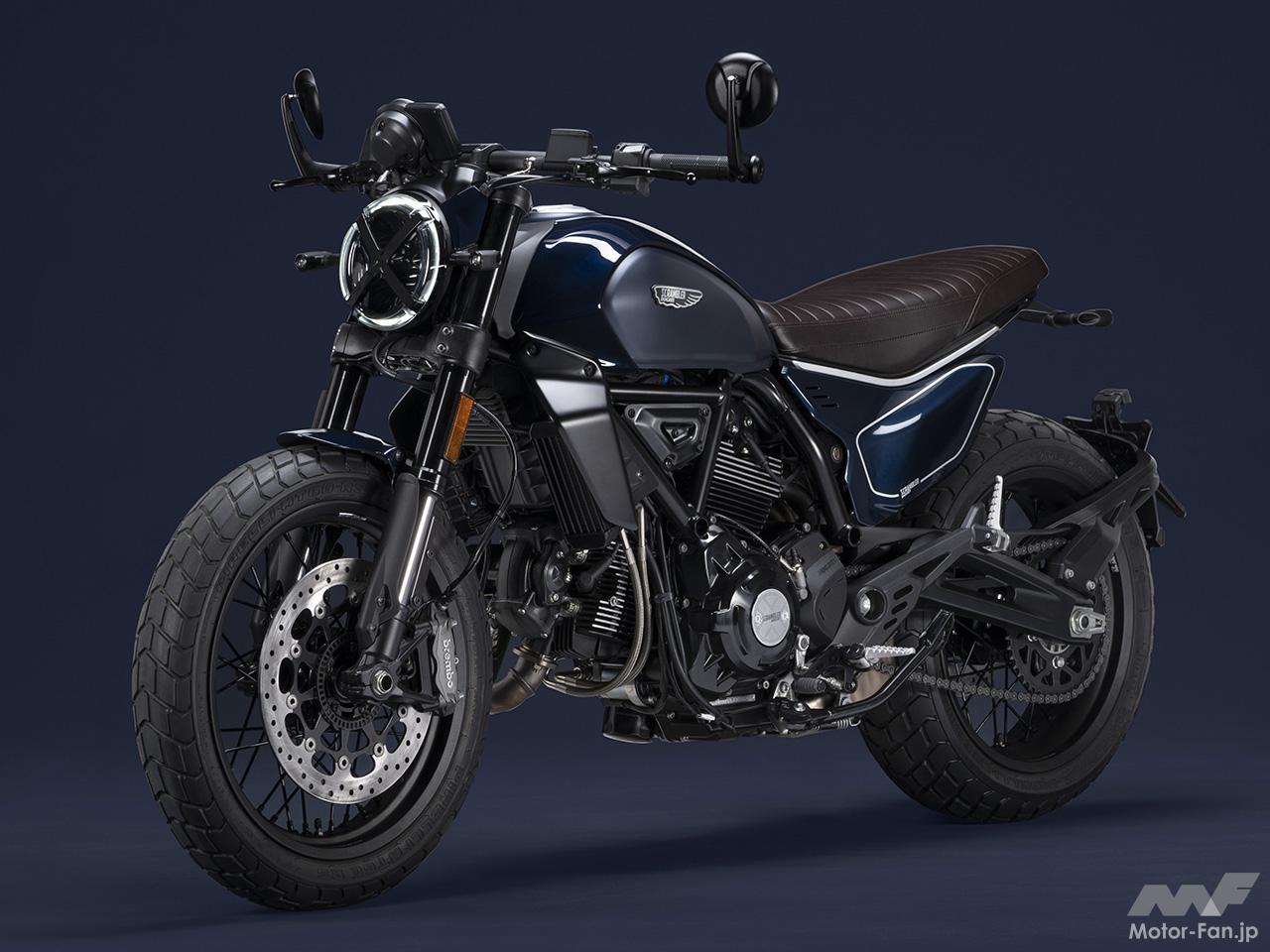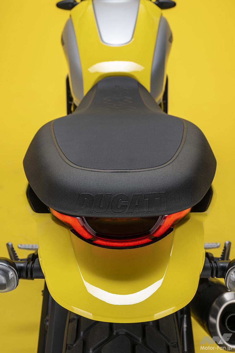空冷4ストロークL型2気筒803ccのデスモドロミック2バルブエンジンを搭載したモデルは、2019年モデルより登場。今回発表された2023年モデルは、タンクやテールのデザインを一新。また、シャシーのベースとなるトレリスフレームとスイングアームも変更された。