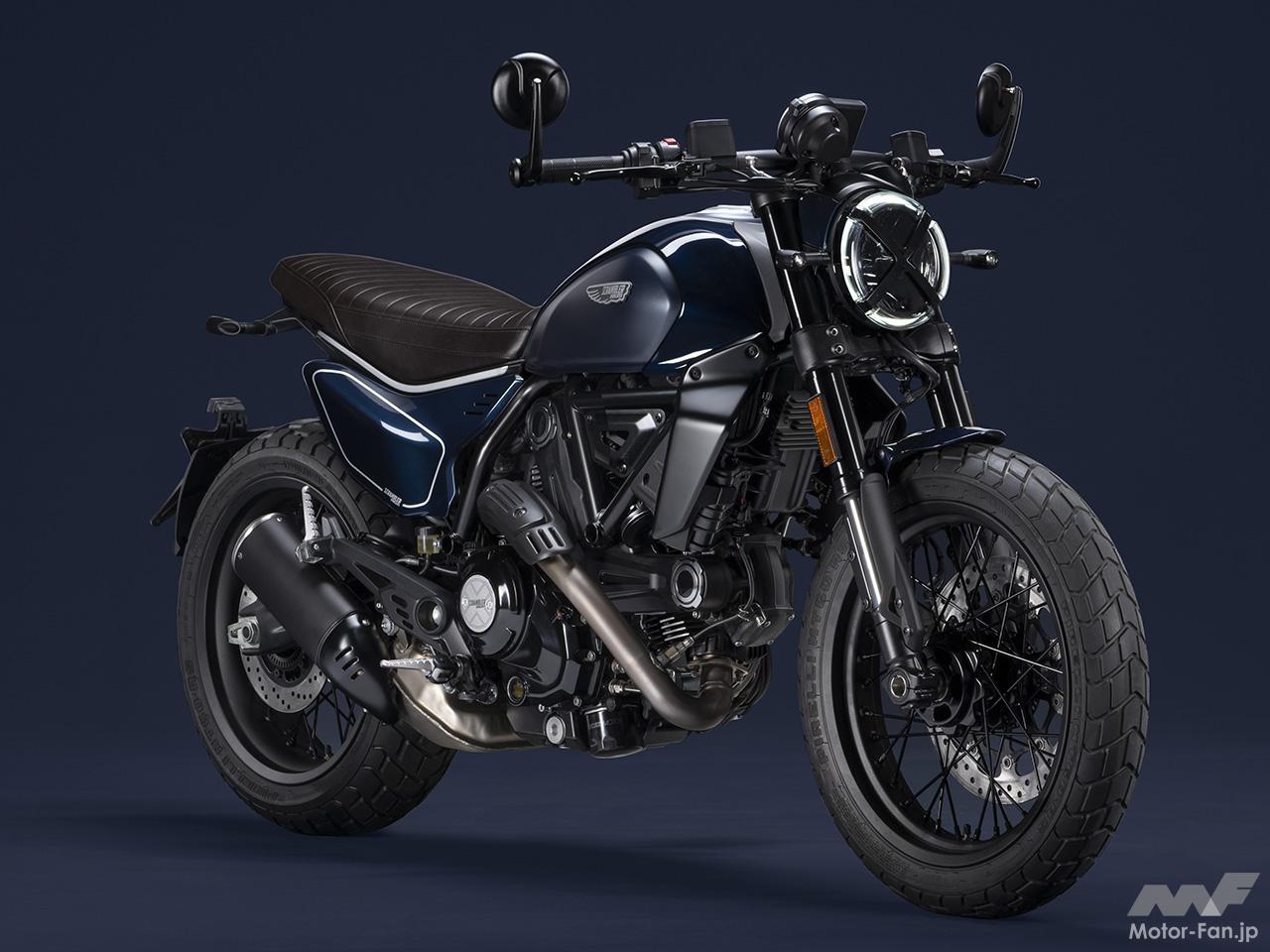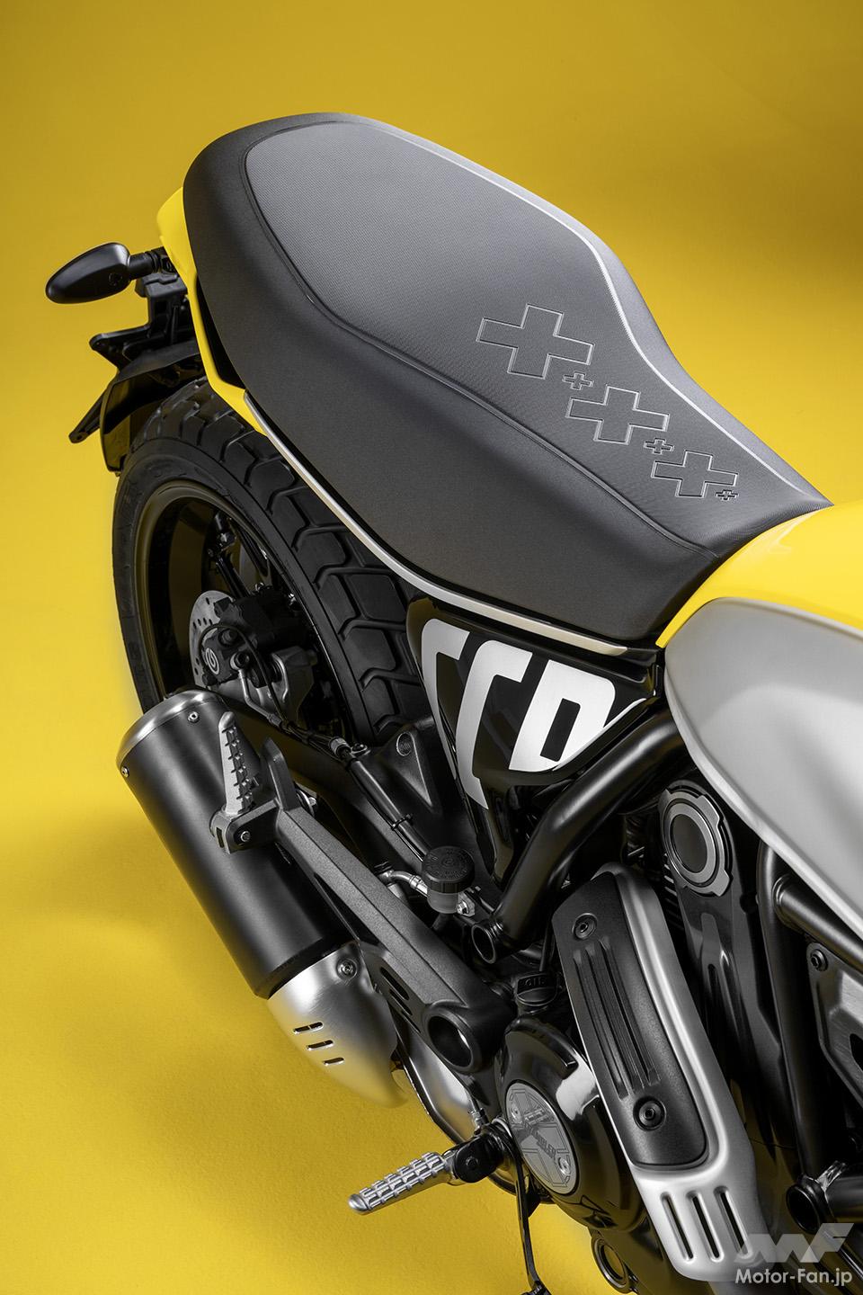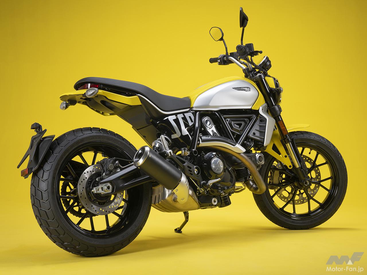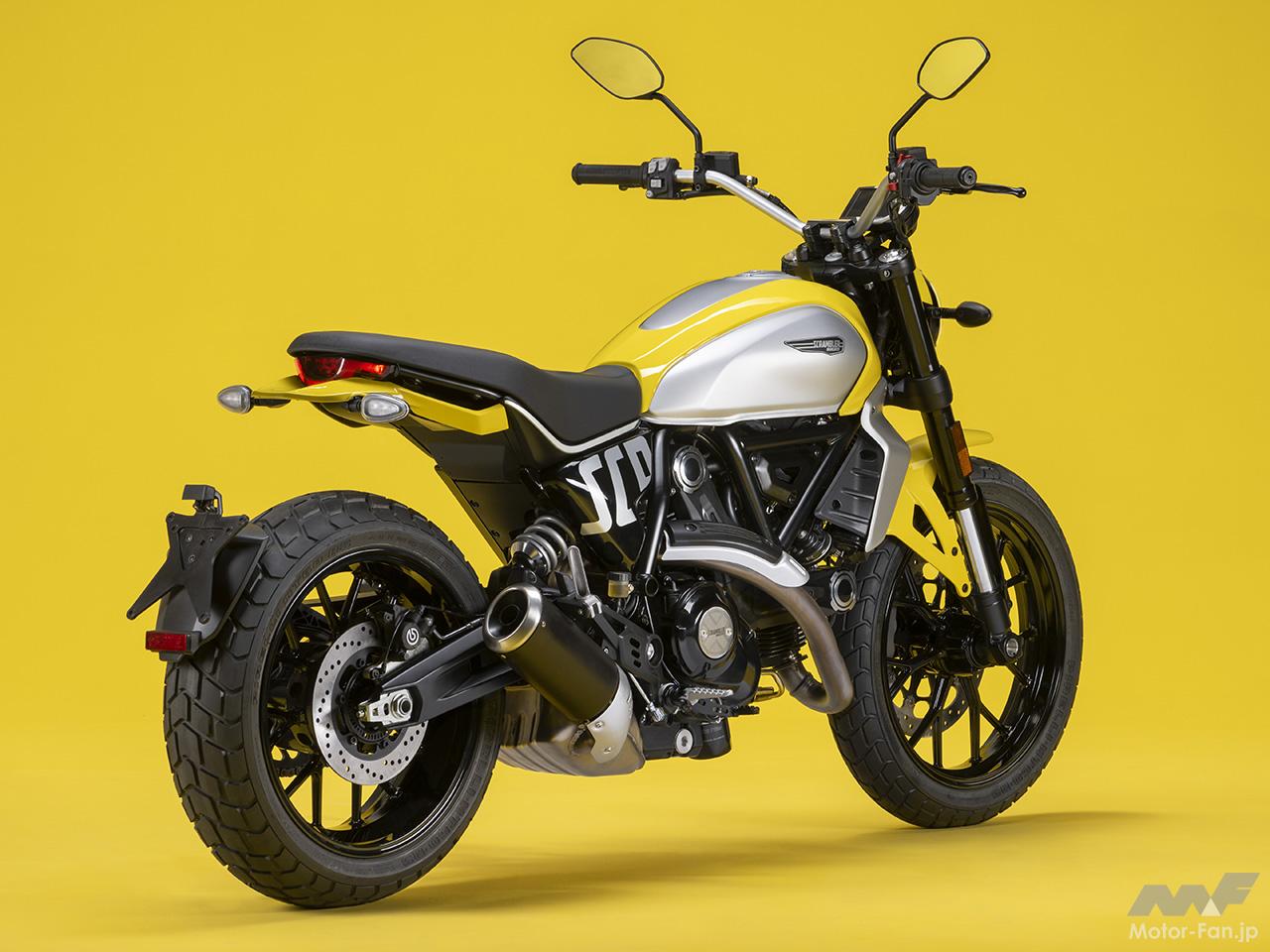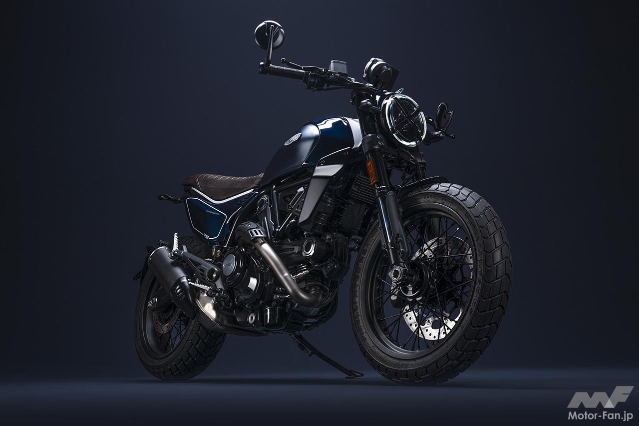 空冷4ストロークL型2気筒803ccのデスモドロミック2バルブエンジンを搭載したモデルは、2019年モデルより登場。今回発表された2023年モデルは、タンクやテールのデザインを一新。また、シャシーのベースとなるトレリスフレームとスイングアームも変更された。