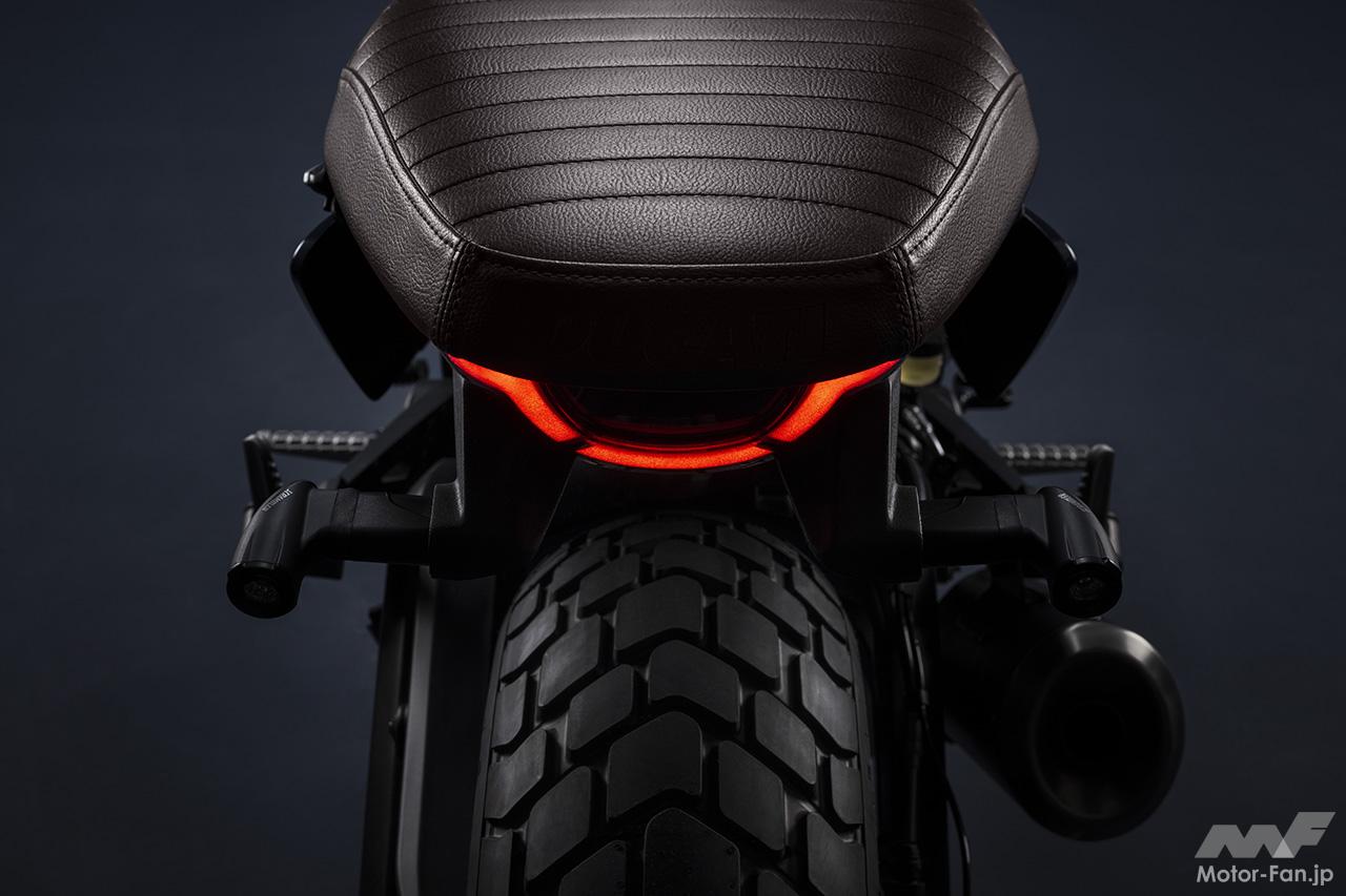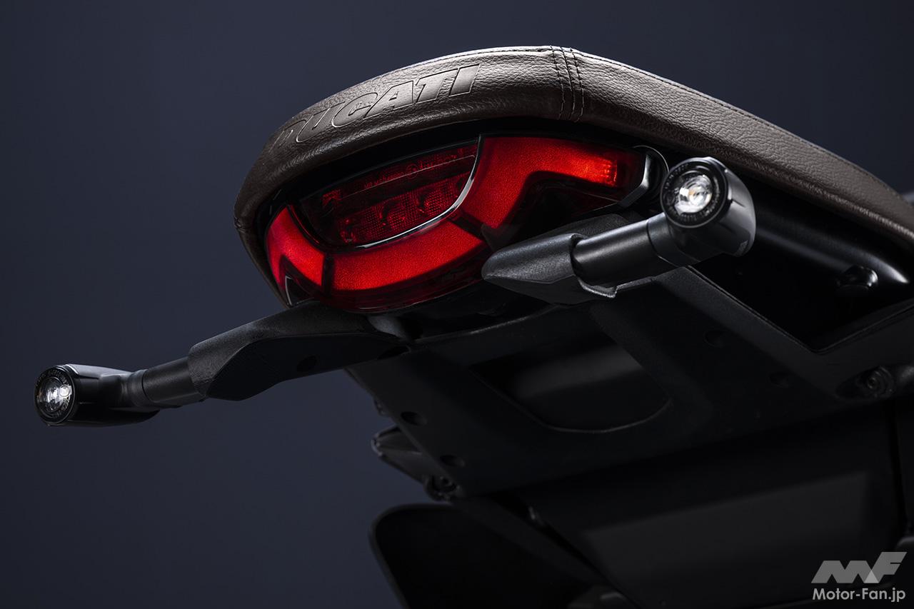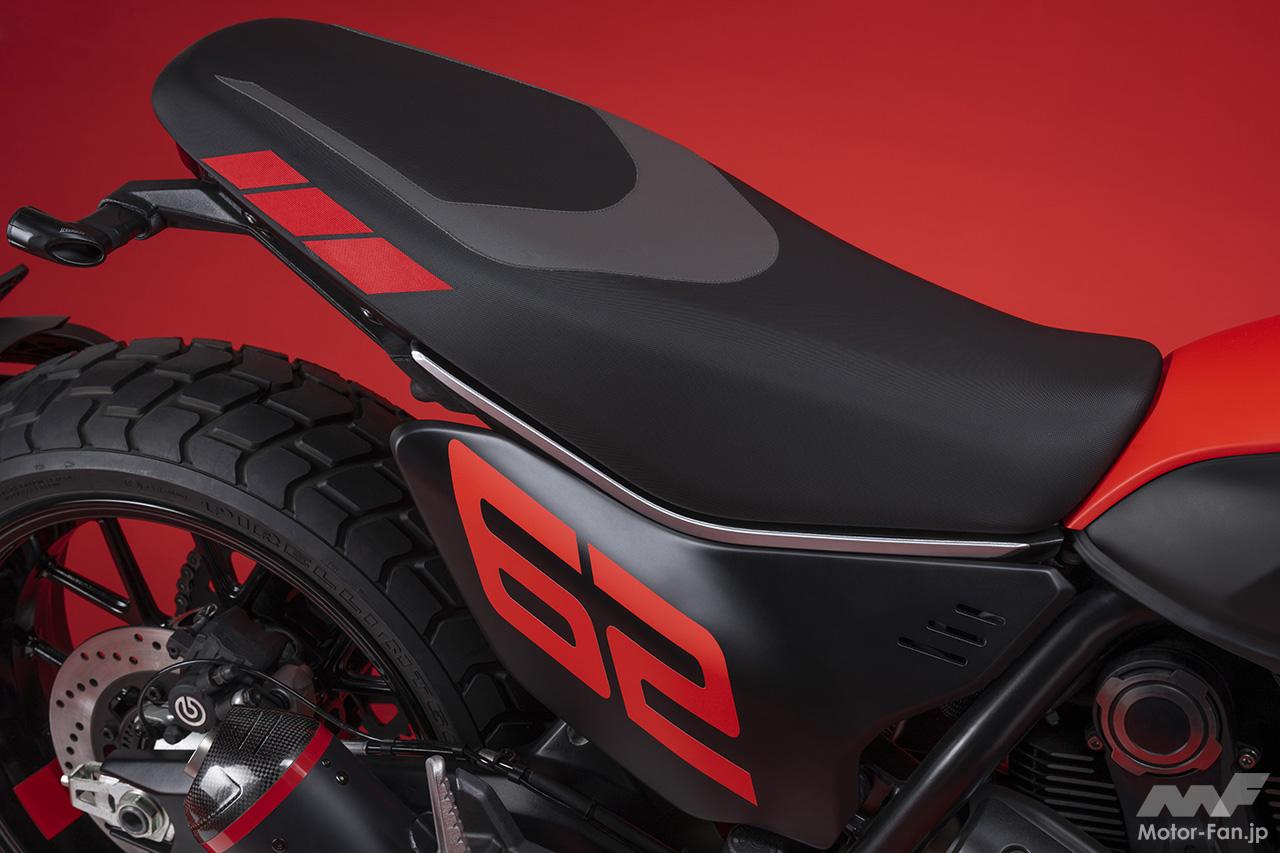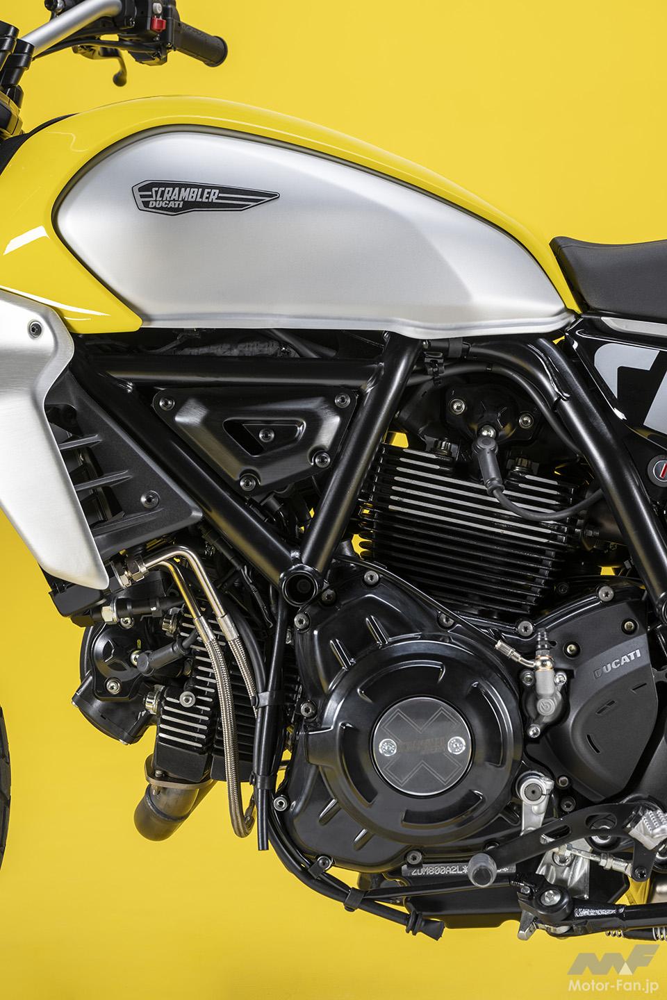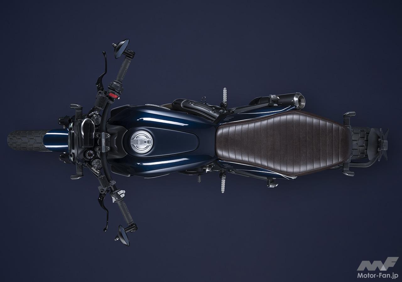 空冷4ストロークL型2気筒803ccのデスモドロミック2バルブエンジンを搭載したモデルは、2019年モデルより登場。今回発表された2023年モデルは、タンクやテールのデザインを一新。また、シャシーのベースとなるトレリスフレームとスイングアームも変更された。