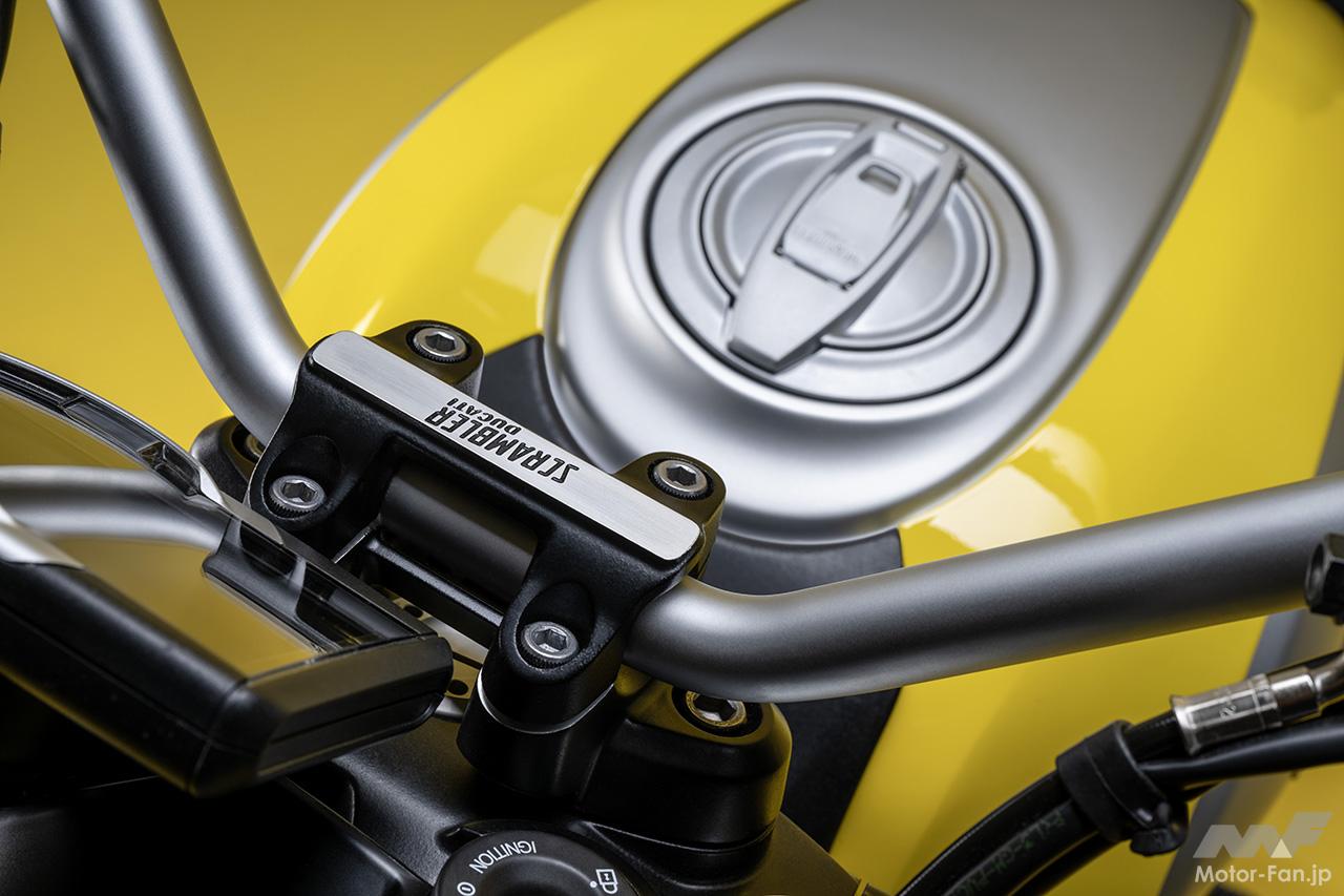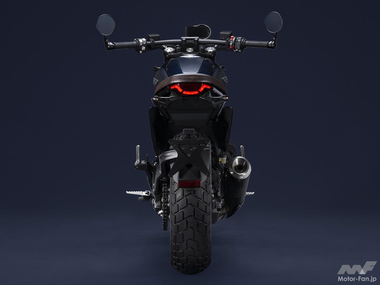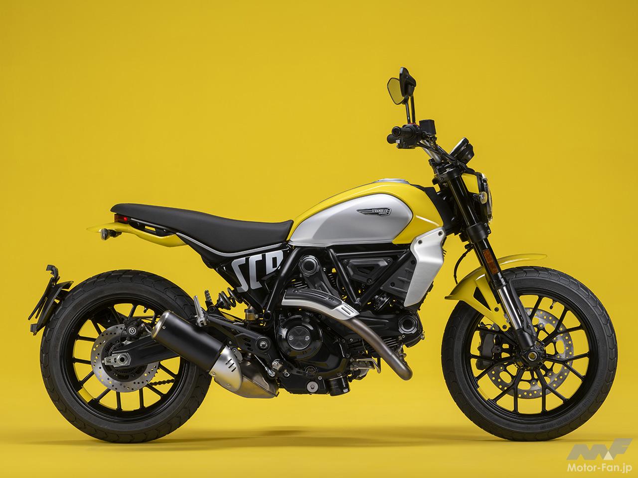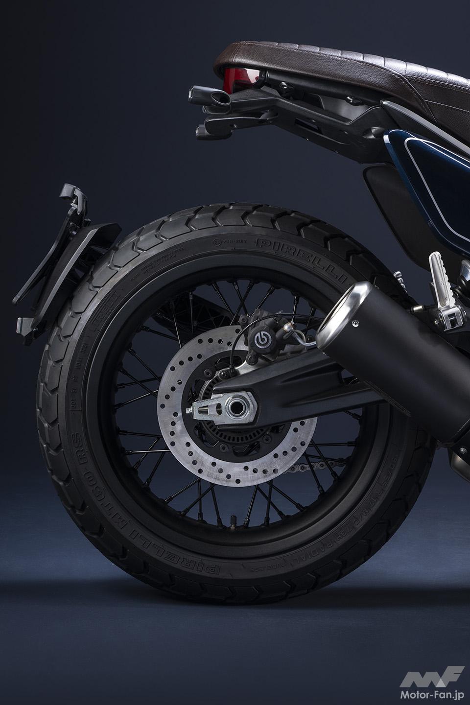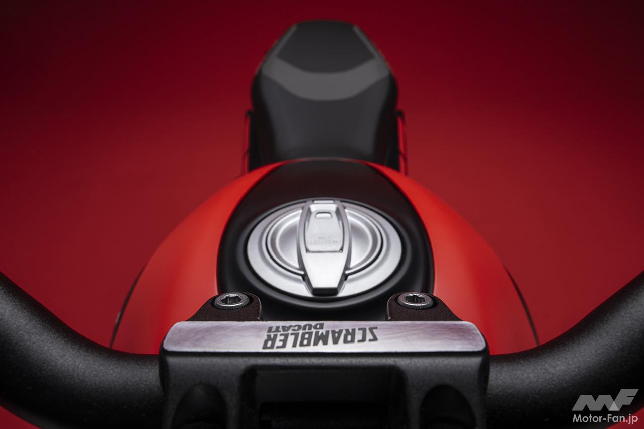 空冷4ストロークL型2気筒803ccのデスモドロミック2バルブエンジンを搭載したモデルは、2019年モデルより登場。今回発表された2023年モデルは、タンクやテールのデザインを一新。また、シャシーのベースとなるトレリスフレームとスイングアームも変更された。