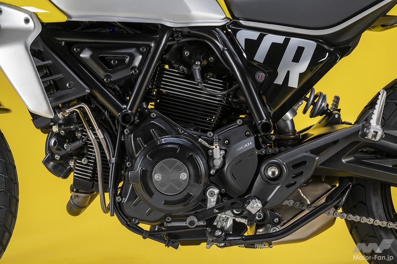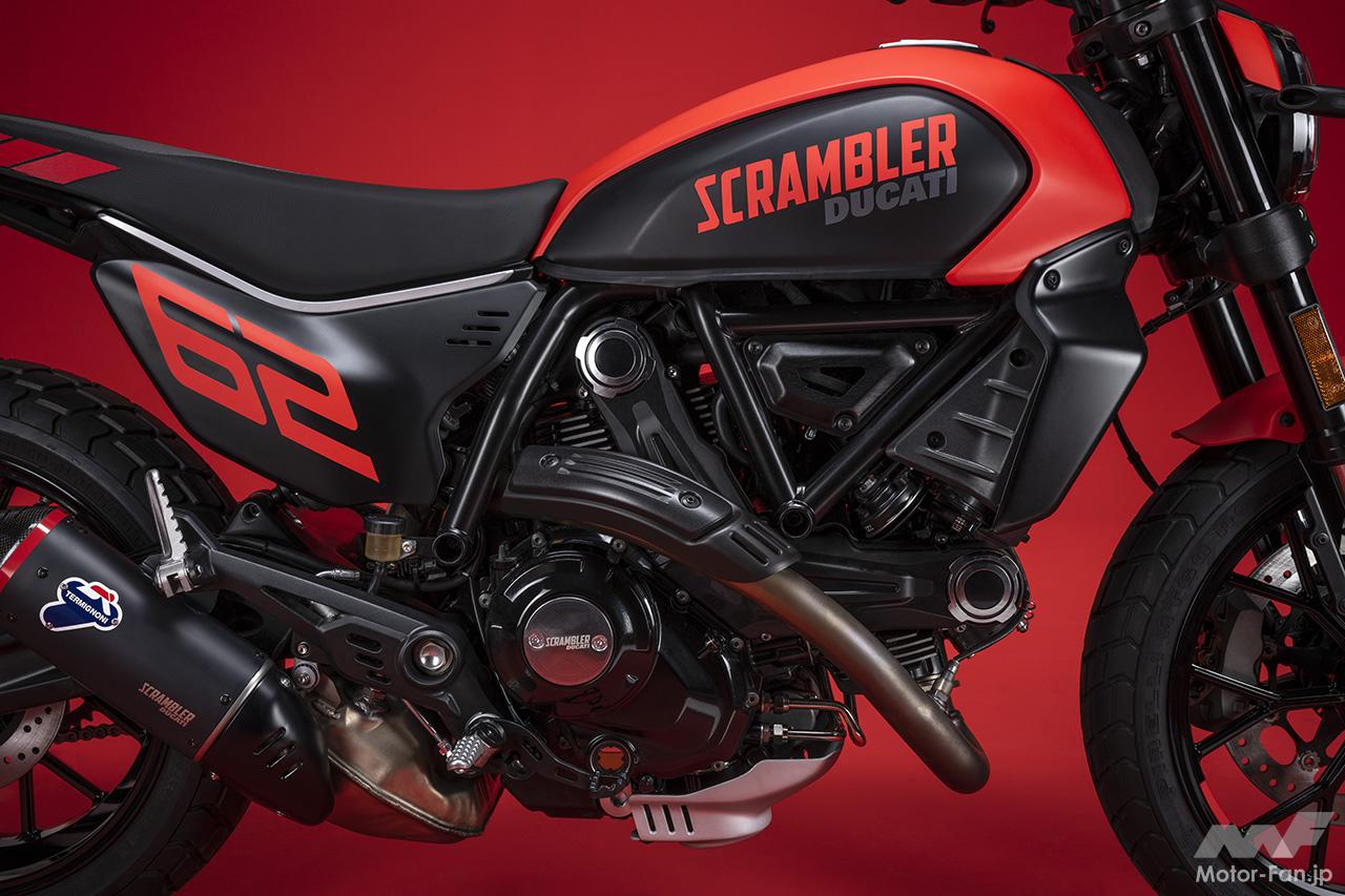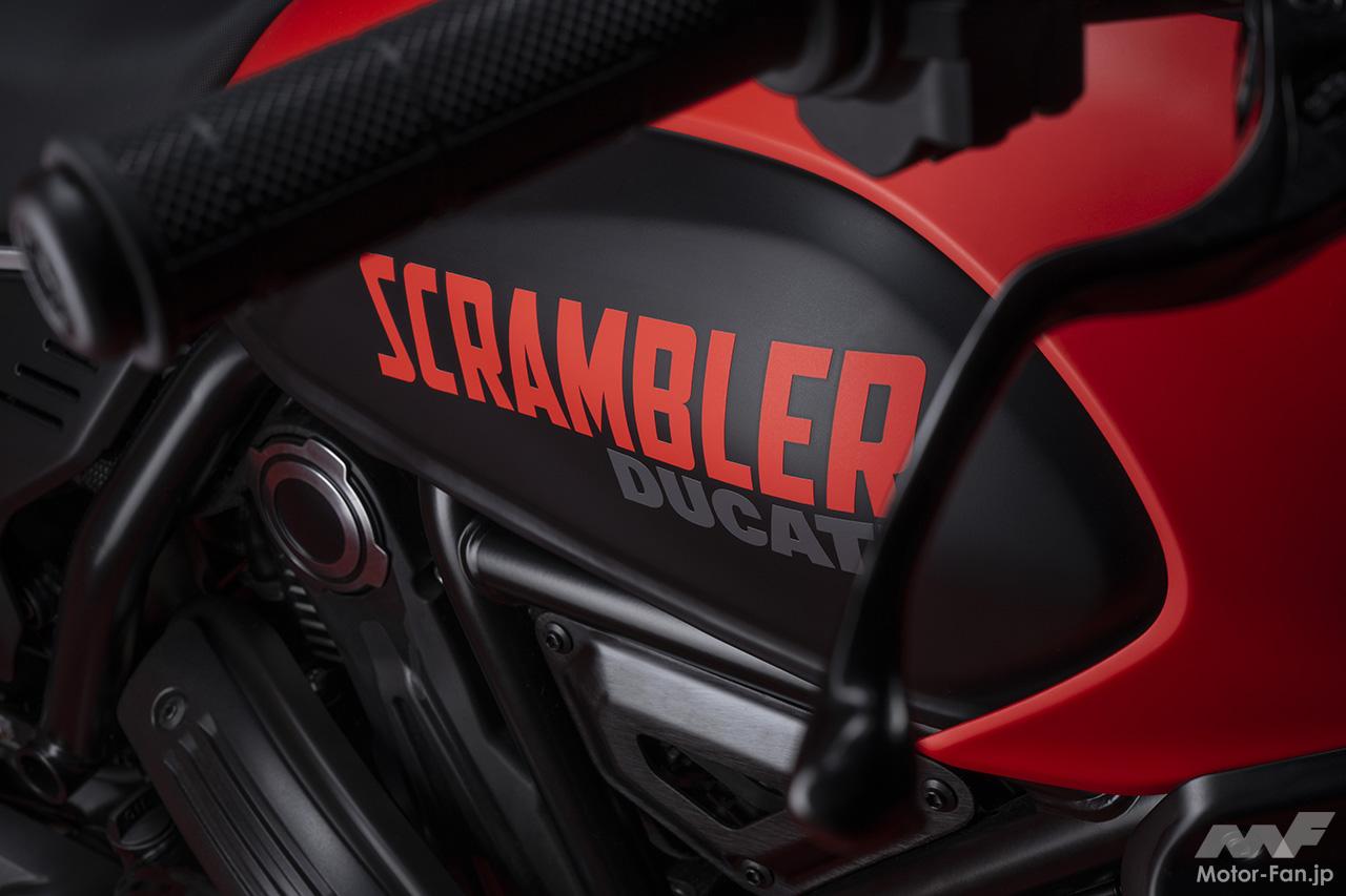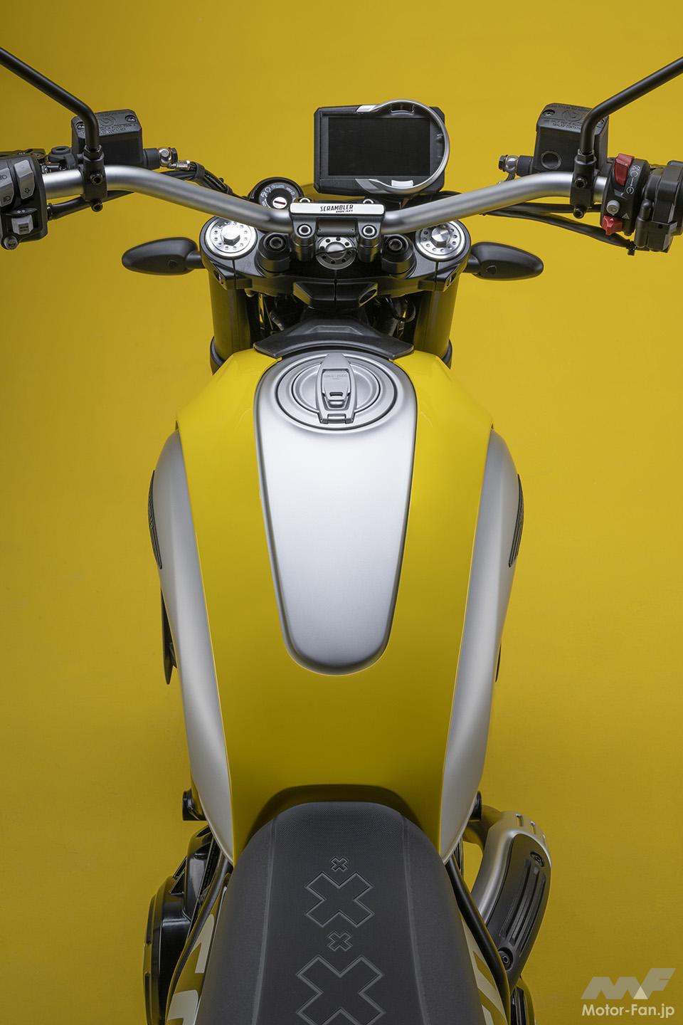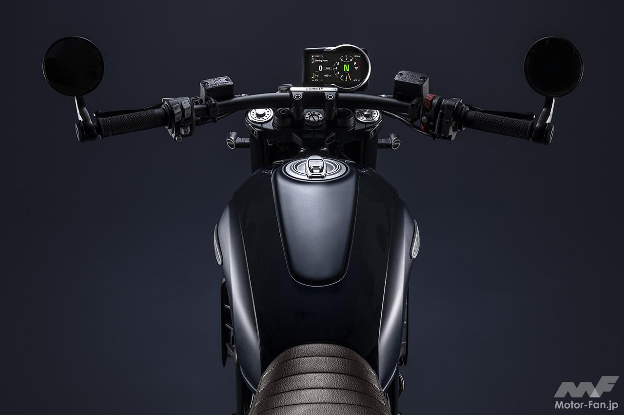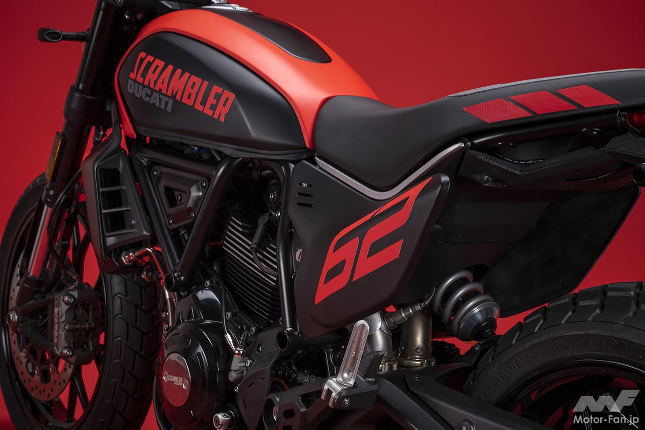 空冷4ストロークL型2気筒803ccのデスモドロミック2バルブエンジンを搭載したモデルは、2019年モデルより登場。今回発表された2023年モデルは、タンクやテールのデザインを一新。また、シャシーのベースとなるトレリスフレームとスイングアームも変更された。