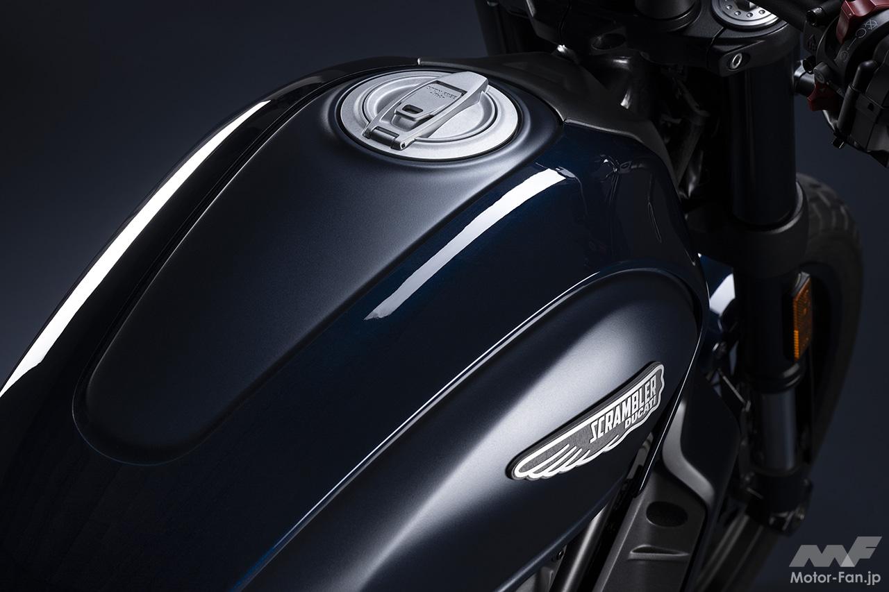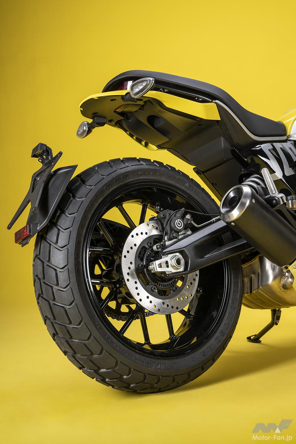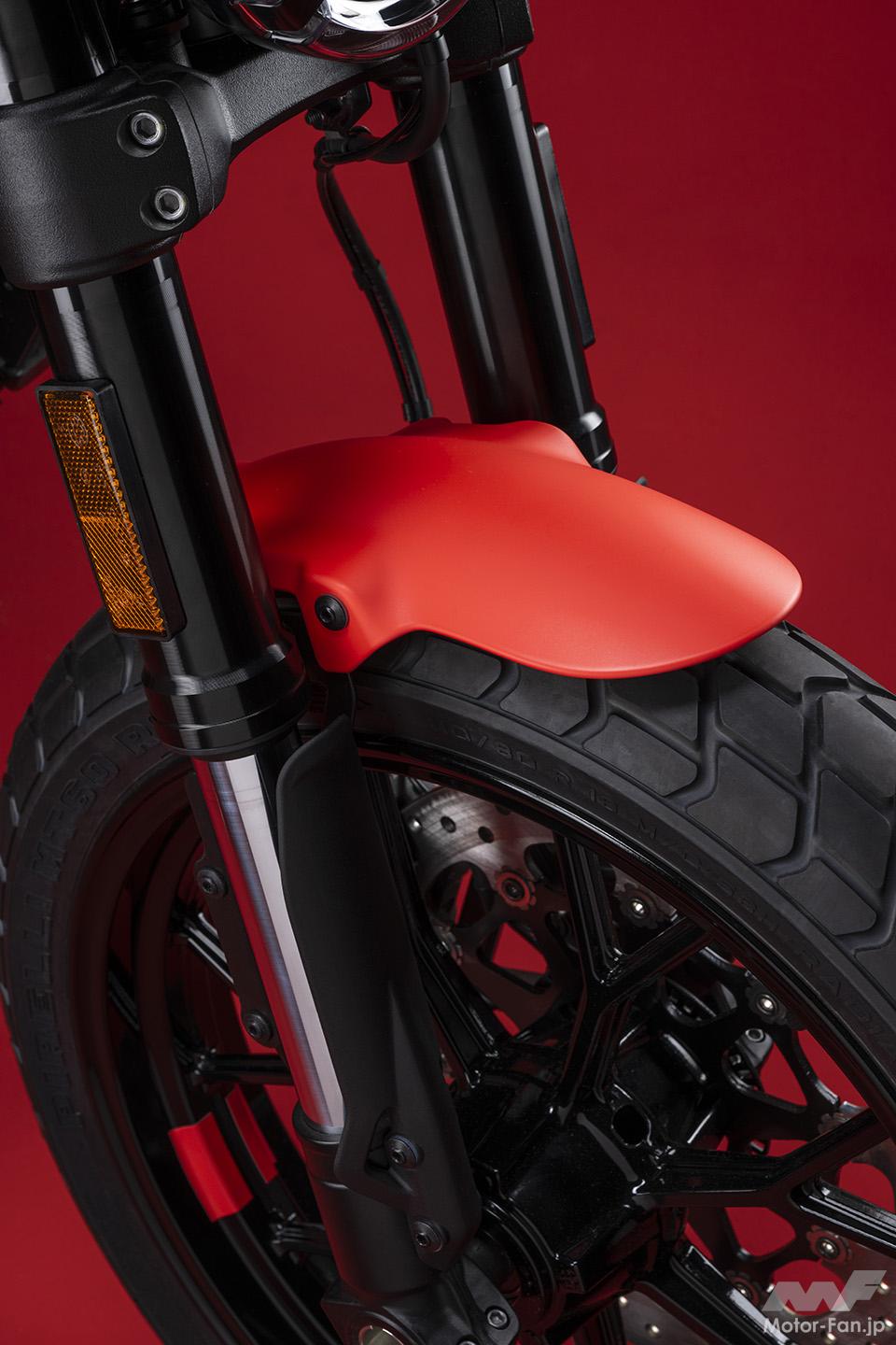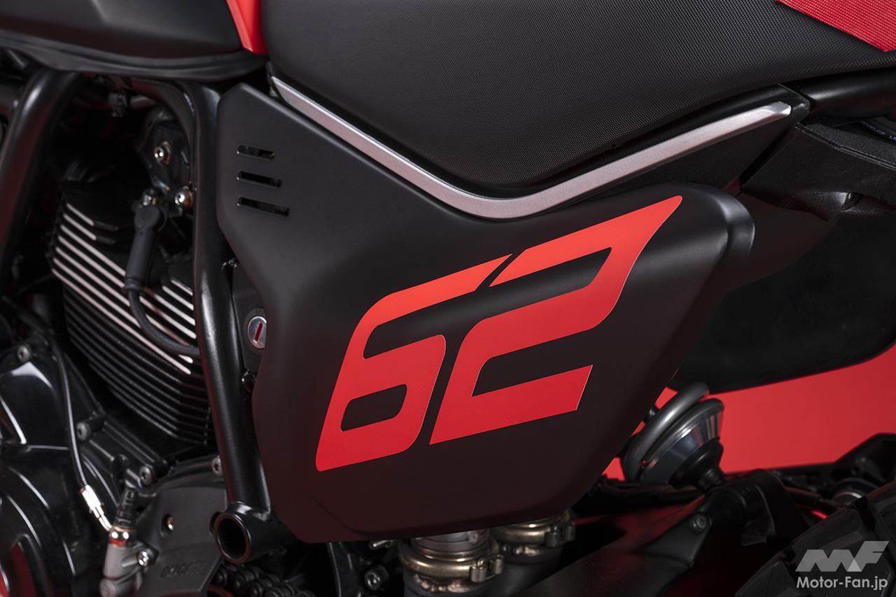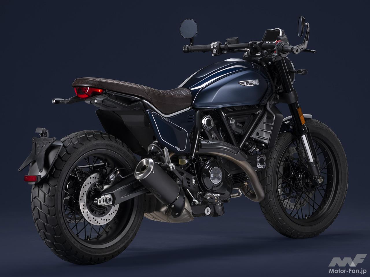 空冷4ストロークL型2気筒803ccのデスモドロミック2バルブエンジンを搭載したモデルは、2019年モデルより登場。今回発表された2023年モデルは、タンクやテールのデザインを一新。また、シャシーのベースとなるトレリスフレームとスイングアームも変更された。
