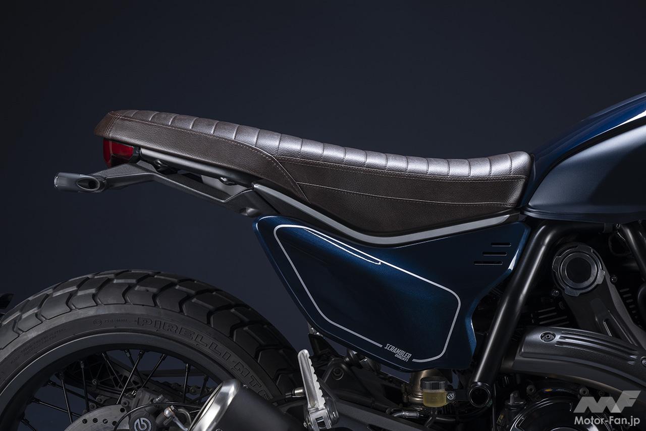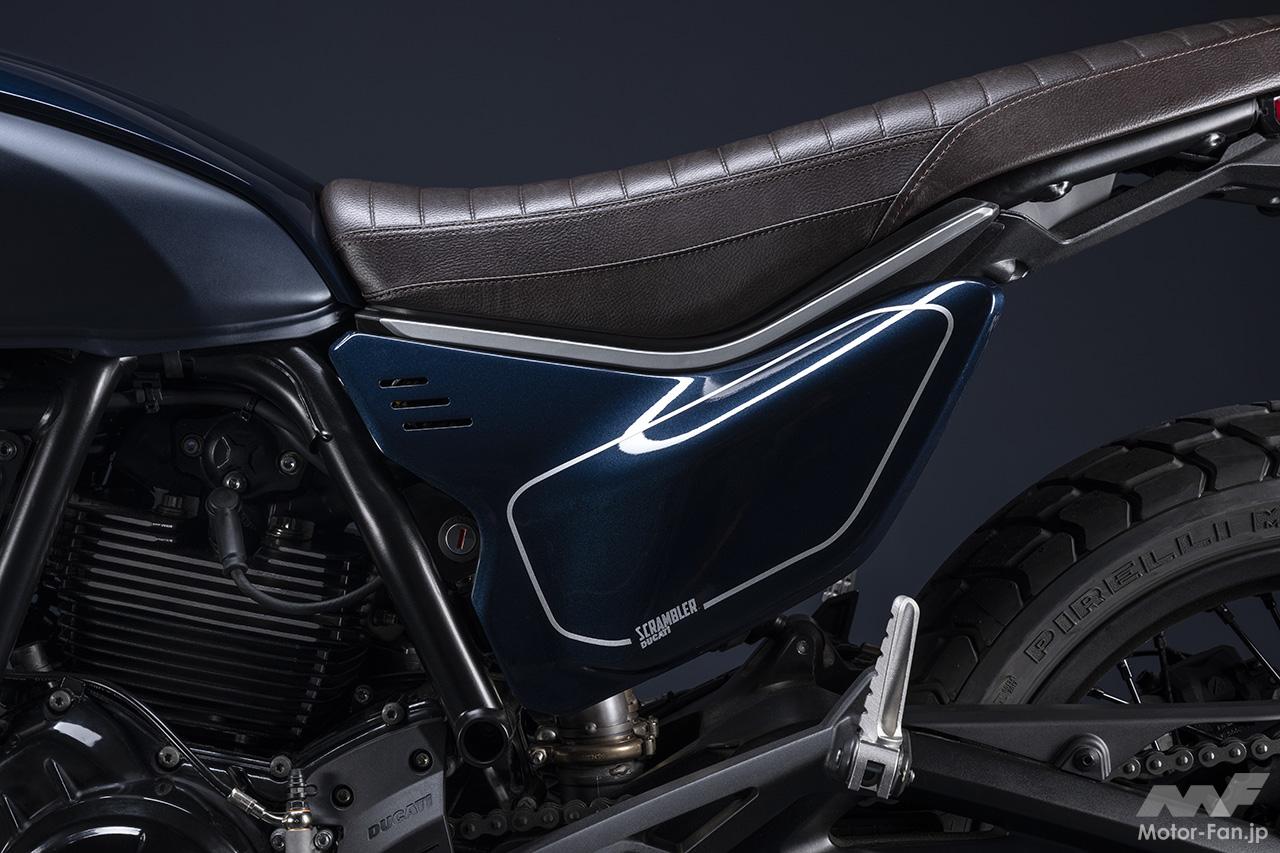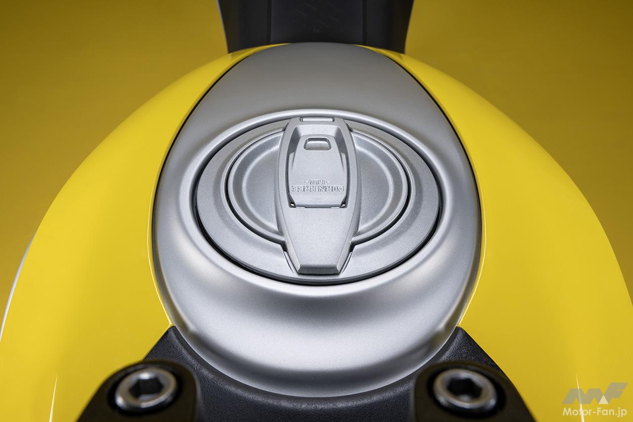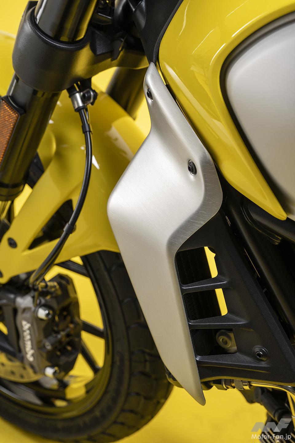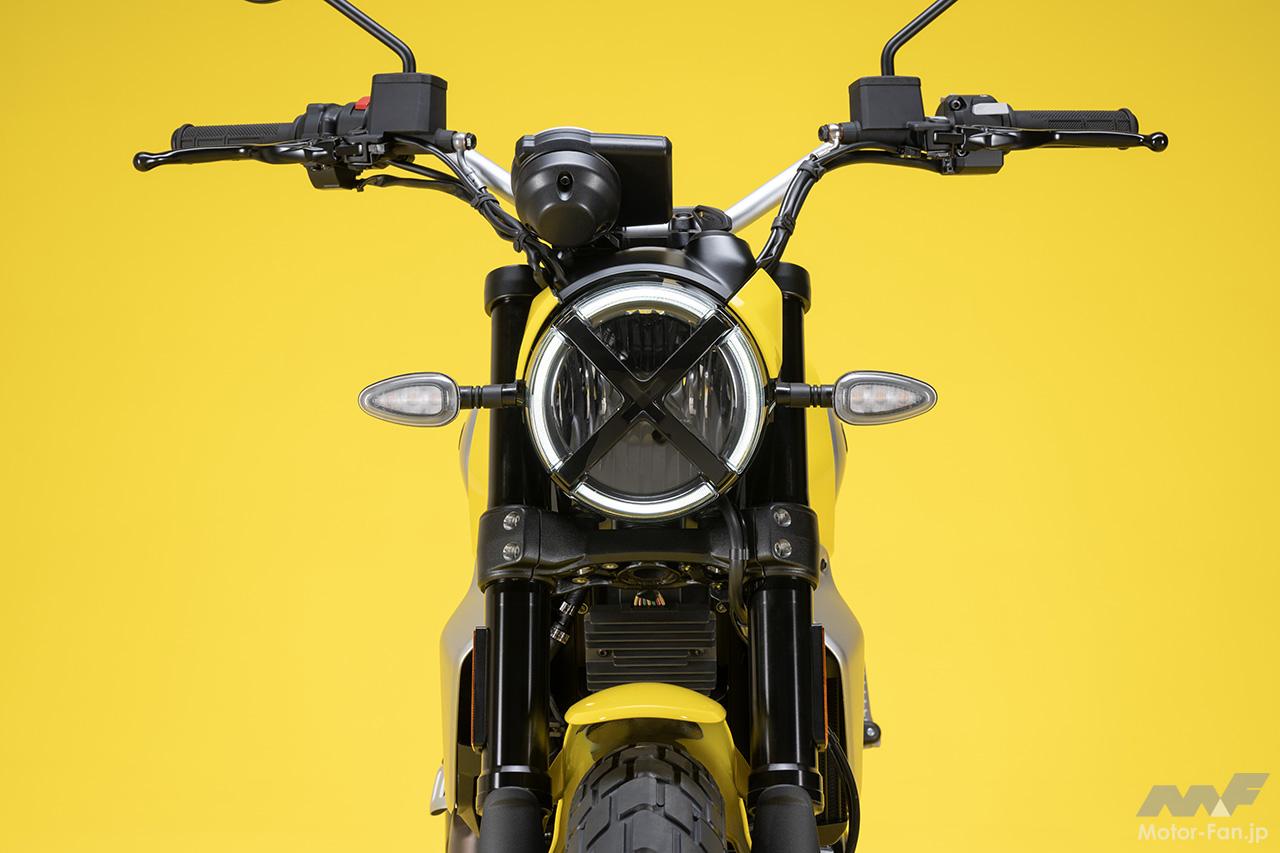 空冷4ストロークL型2気筒803ccのデスモドロミック2バルブエンジンを搭載したモデルは、2019年モデルより登場。今回発表された2023年モデルは、タンクやテールのデザインを一新。また、シャシーのベースとなるトレリスフレームとスイングアームも変更された。