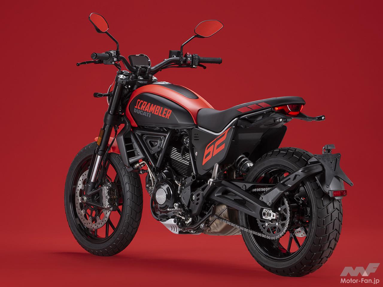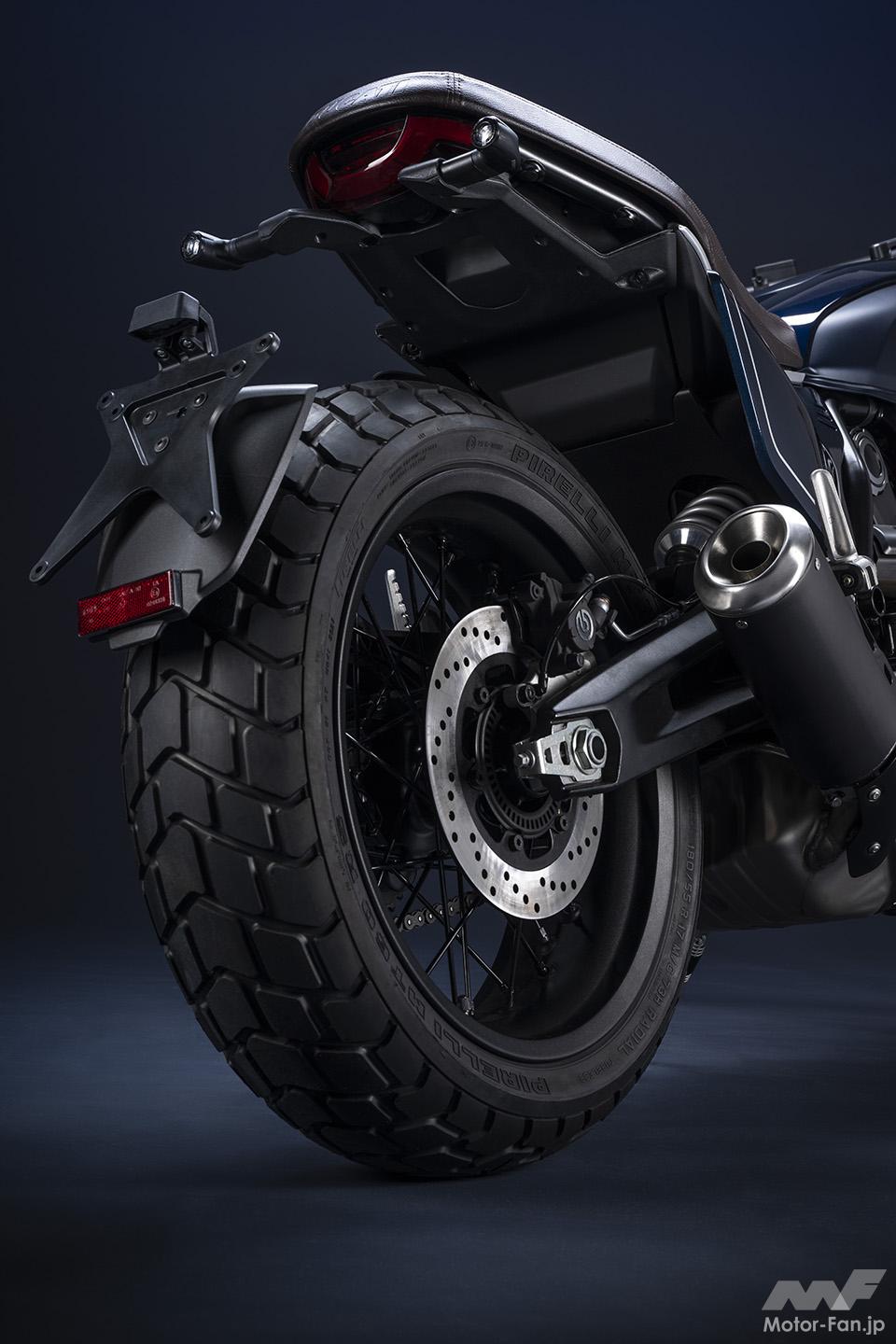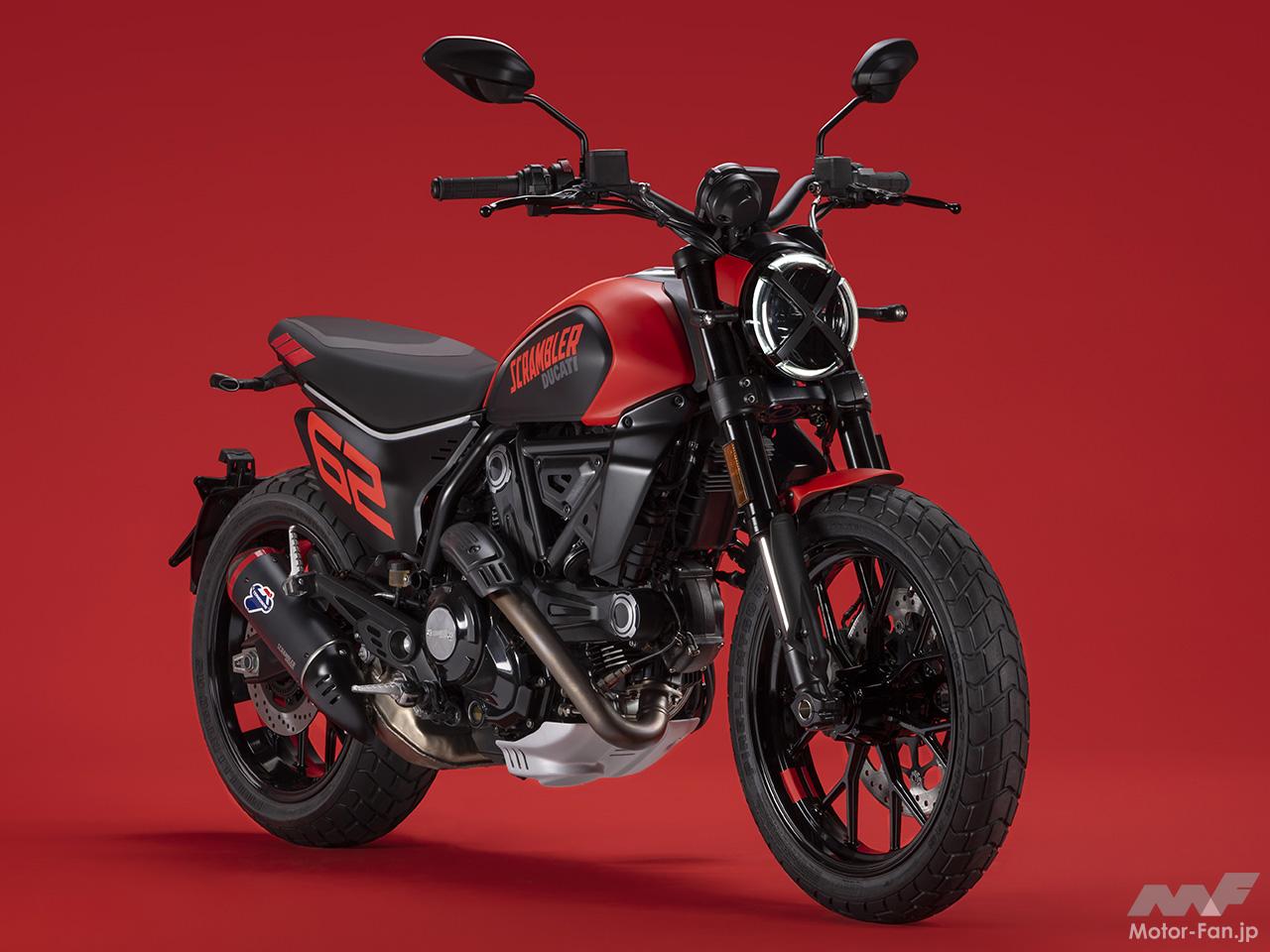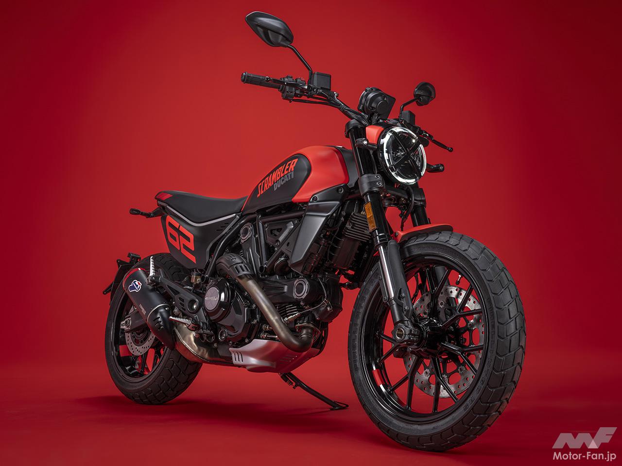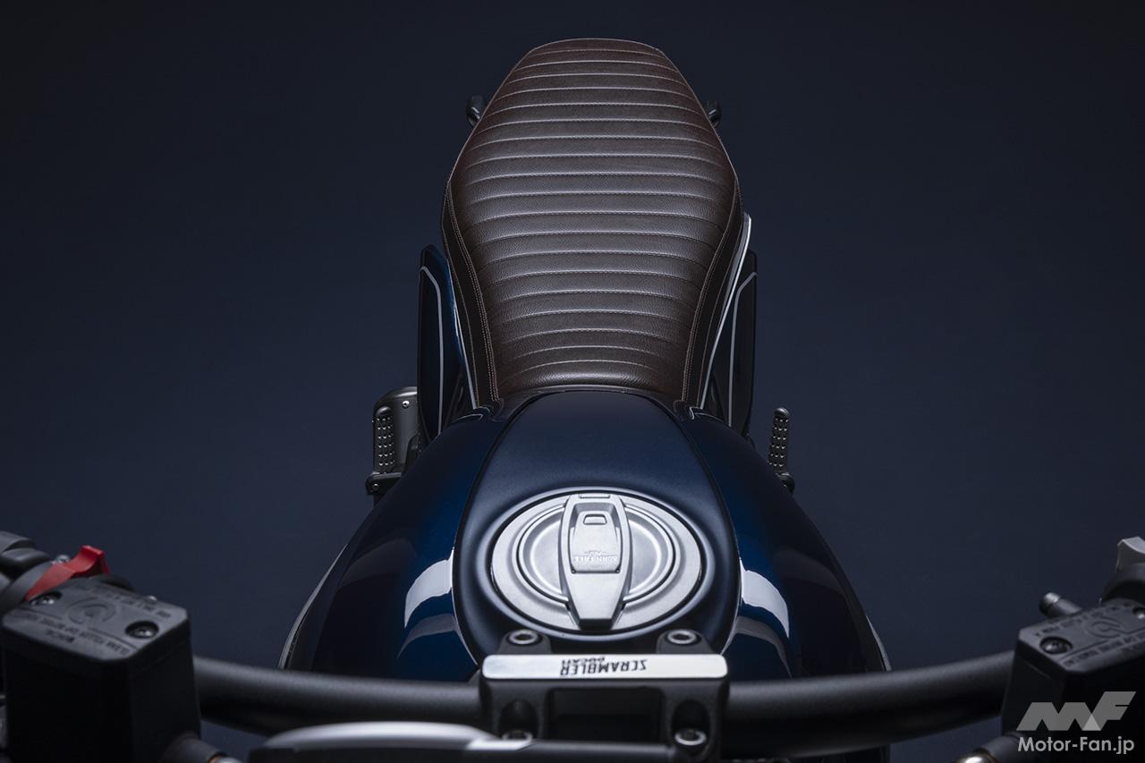 空冷4ストロークL型2気筒803ccのデスモドロミック2バルブエンジンを搭載したモデルは、2019年モデルより登場。今回発表された2023年モデルは、タンクやテールのデザインを一新。また、シャシーのベースとなるトレリスフレームとスイングアームも変更された。