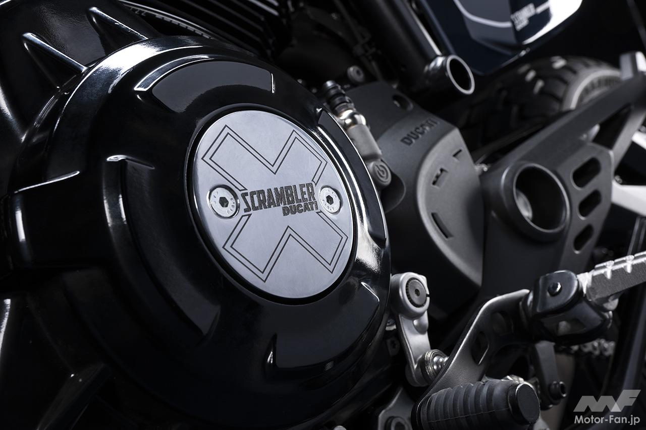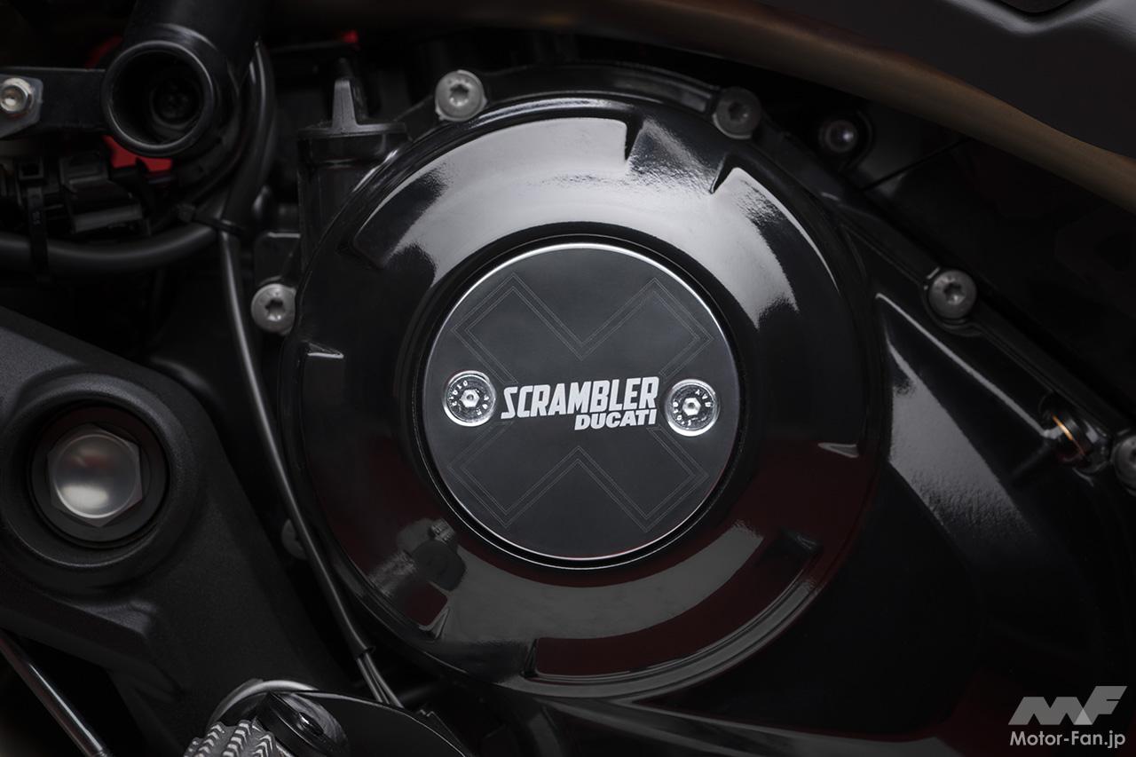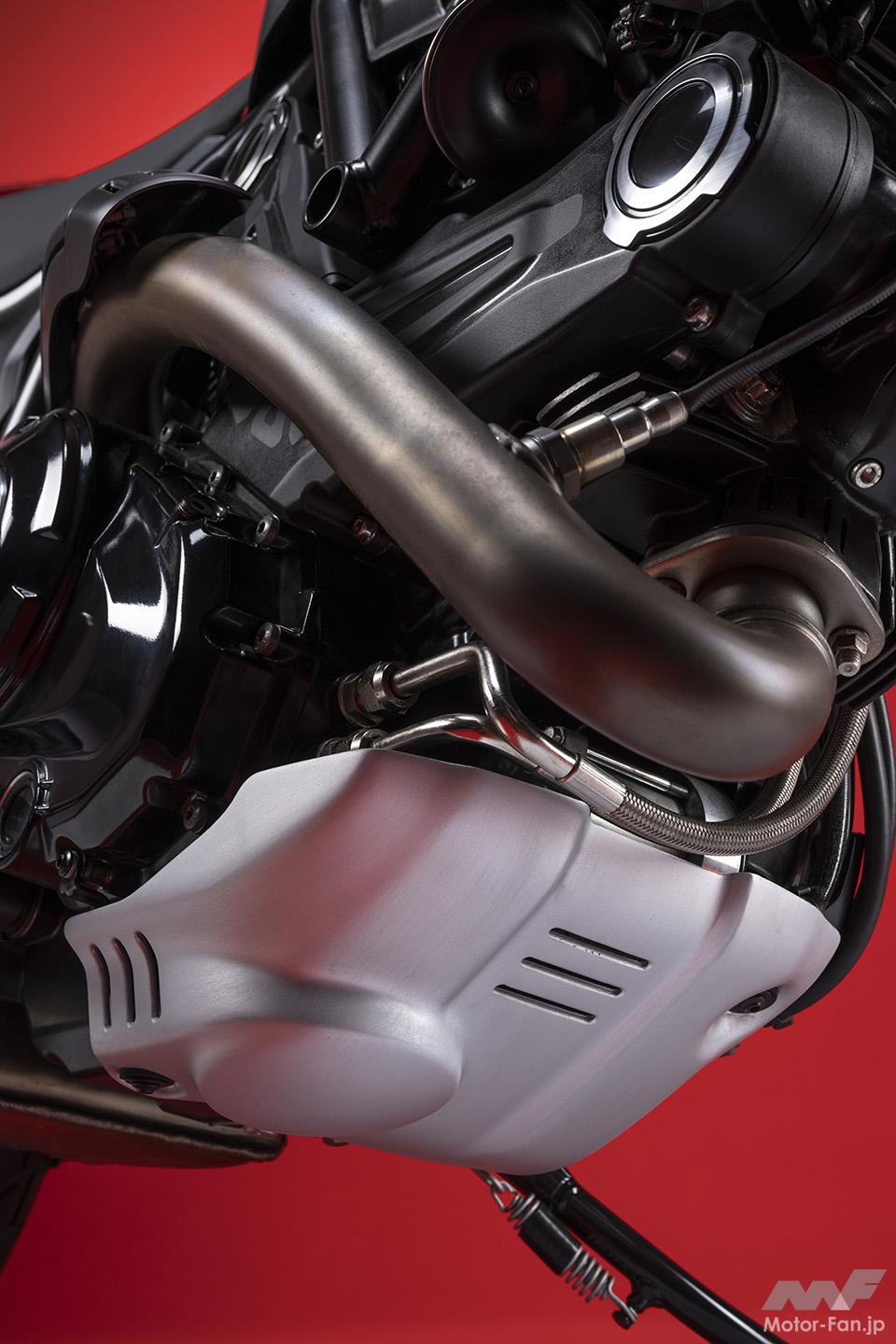 ドゥカティ伝統のデスモドロミックエンジンは細部を刷新。前モデルよりも約2.5kgの軽量化に成功し、各部のフリクションを低減してレスポンスを向上。また、「X」ロゴをあしらった新しいクラッチカバーなど、エンジン各部のカバー類を一新した。